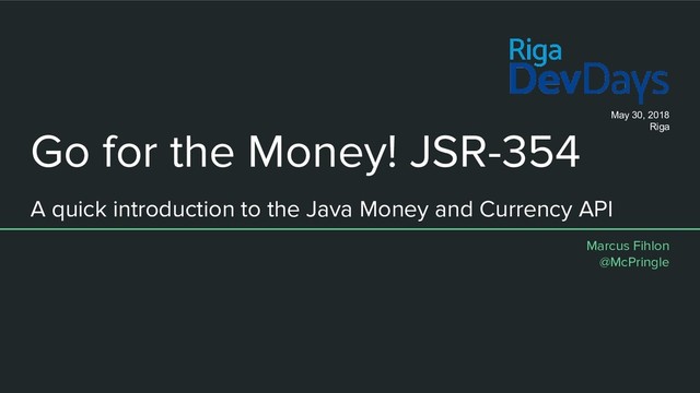Java Money and Currency API Marcus Fihlon @McPringle May 30, 2018 Riga