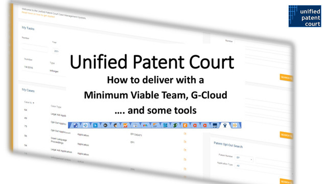 Systems Rhythms & Events Features & Benefits User Needs October ‘15 November ‘15 December ‘15 January ‘16 February ‘16 March ‘16 April ‘16 May ‘16 June ‘16 August ‘16 July ‘16 Stockholm Workshop The Hague Workshop Luxembourg Workshop Munich Workshop Duseldorf Workshop Rome Workshop Central Email / File Service for Court Two Factor Authentication ------------------------ Improved Security Updated User Interface ----------------------- Improved Ease of Use 18th Edition Rules of Procedure Published European Judges’ Forum Enhancements Improvements based on Workshop Feedback Enhancements Improvements based on Workshop Feedback Enhancements Improvements based on Workshop Feedback Enhancements Improvements based on Workshop Feedback Enhancements Improvements based on Workshop Feedback Fees Agreed Corporate Website Alpha Two Factor Authentication Service Handover to UPC IT Team Budapest Training Centre Mediation / Arbitration Centre Credit Payment Service Credit Card Payments ----------------------- Improved Ease of Payment Patent Opt-out Infringement Action New Input Form Handover of court output templates from drafting committee Corporate Website Beta Corporate Website Live Central Court Email / File service production infrastructure Digital Certificate Service All Services over HTTPS ------------------------- Improved Security User Interface ------------------------ Case Navigation (1st release) USer interface and Document management Multiple Claimants and Defendants Updated Users Structure Role Based Access Court Configuration Lists Functionality --------------------------------------- European Patent Attourneys Court Experts Arbitrators Mediators Languages User Interface ----------------------- Roles and usability improvements Opt-Out and Withdraw Enhancements -------------------------------- Isolate payment from form completion Basket for Payments ----------------------- Improved Ease of Payment Representative Lists ----------------------- Representative can register to appear in online searchable directory Court letters and orders updated Court Expert List ------------------------- Court Experts can register to appear in online searchable directory Calendar and user interface improvements Lists Functionality Judges Admin interface User Interface ----------------------- Case Navigation (2nd release) Calendar and tree view integration) Actions and Applications (list 2) Actions and Applications (list 1) Various Optimisations Automated Emails Localisation Responsiveness Mobile Support All fees updated in Case Management System External APIs (Interface to external systems) ------------------------ Query/Read Court Open Data Production Case Management System Cluster optimisation Production Case Management System Infrastructure Released Mobile Access to Court Calendars Enhancements ---------------------------------------------- Improvements based on Continuous Feedback via BugHerd Court of Appeal Multiple Representatives API Caching/Security/Rate Limiting Service Enhancements Improvements based on Workshop Feedback Alpha Internal API Service Production Internal API Service Call for Arbitrators / Mediators / Court Experts / European Patent Attorneys Representative Lists ----------------------- European Patent Attorneys can register to appear in online searchable directory Contract Novation to UPC Kevin Mooney / Drafting Committee IT Working Group Chaired by UPC IT Working Group Chaired by IPO Final Language Translations / Versions Registrar Security Operating Procedures ISMS Recruitment UPC IT Lead / Team Kevin Mooney / Drafting Committee Certified Forms / Templates Tuning of system for internal court users ----------------------------------------------------------------- Configuration for Mediation and Arbitration Centre ----------------------------------------------------------------- Infrastructure to support Mediation & Arbitration Centre Corporate Website Integration with Case Management System