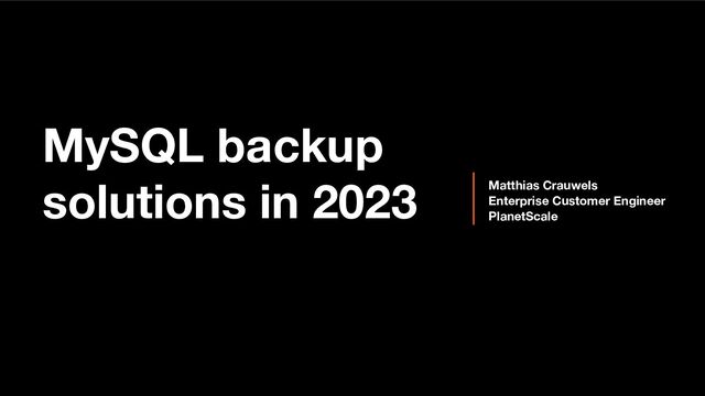 Backups are important! Everyone makes mistakes, bugs are easily overlooked, hardware will fail eventually. If you don't want to lose data when disaster strikes, your backups will be your saviour. In this talk I will guide you through some of the most common backup techniques for MySQL that we use in 2023. I will explain the strengths and weaknesses of each solution.