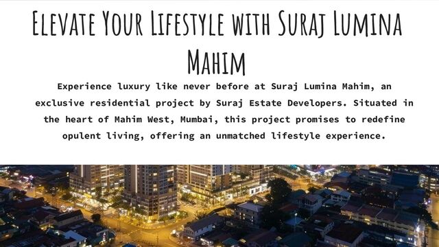 Suraj Lumina Mahim skillfully combines Mumbai's downtown with contemporary elegance. This residential oasis combines a combination of warmth and refinement with luxurious 2/3 BHK apartments, amenities, and well-landscaping. Inspired by a dedication to quality, creativity, and community, this architectural wonder sets a record for urban living in the thriving metropolis. The modern way of life judges the grandeur of life.