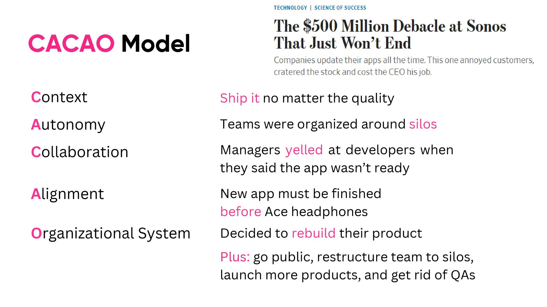 before Ace headphones Managers yelled at developers when they said the app wasn’t ready Teams were organized around silos Ship it no matter the quality CACAO Model Organizational System Alignment Collaboration Autonomy Context Plus: go public, restructure team to silos, launch more products, and get rid of QAs
