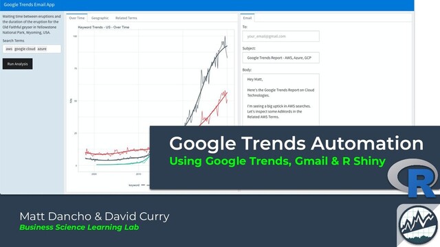 In Lab 27, we use R Shiny, Gmail API, and Google Trends API to streamline an entire Google Trends Analysis Workflow by assessing trends and efficiently emailing reports to those in your organization that need them.