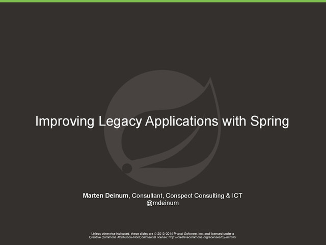 Inc. and licensed under a Creative Commons Attribution-NonCommercial license: http://creativecommons.org/licenses/by-nc/3.0/ Improving Legacy Applications with Spring Marten Deinum, Consultant, Conspect Consulting & ICT @mdeinum