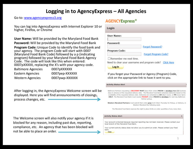 You can log into AgencyExpress with Internet Explorer 10 or higher, Firefox, or Chrome User Name: Will be provided by the Maryland Food Bank Password: Will be provided by the Maryland Food Bank Program Code: Unique Code to identify the food bank and your agency. The program Code will start with 0007 (Maryland Food Bank Code) followed by a p (indicating program) followed by your Maryland Food Bank Agency Code. The code will look like this when entered: 0007pXXXXX, replacing the X’s with your agency code. Baltimore Agencies 0007pXXXXXX Eastern Agencies 0007pep-XXXXXX Western Agencies 0007pwp-XXXXXX 1 If you forget your Password or Agency (Program) Code, click on the appropriate link to have it sent to you. After logging in, the AgencyExpress Welcome screen will be displayed. Here you will find announcements of closings, process changes, etc. The Welcome screen will also notify your agency if it is blocked for any reason, including past due, reporting, compliance, etc. An agency that has been blocked will not be able to place an order.