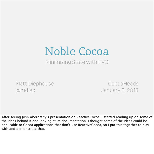 Noble Cocoa is an exploration and demonstration of how some of the ideas presented by the ReactiveCocoa can be applied to a Cocoa app that just uses KVO.