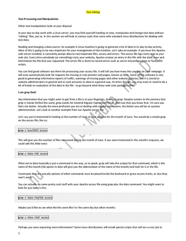 a Linux computer is a file. As we explained in previous section, you hardware is also represented as a series of files (an IDE hard drive is /dev/hda, a modem might be /dev/ttyS1, for example). Seeing that everything is a file, these files have to have a series of permissions assigned to them. These permissions govern the use of and access to a given file. Specifically, they determine whether a file can be read, written (ie, modified, deleted) or, in the case of binary programs, executed. These permissions have to be strictly enforced or you could do a tremendous amount of damage to a system. As we saw in the first course, you can see the permission information by typing: ls -l todo_list Let's say you've just written a to-do list with your favorite text editor. It's likely that on a normal system, you will have created this file with what are known as 'easy' permissions. The output of the previous command would look like this: -rw-r-r- 1 bob users 155 Mar 26 12:33 todo_list The first set of permissions (rw) apply to the owner of the file, bob. These are read and write permissions. The group the file belongs to, users, can read, as we see in the second set of permissions (r). The third set refers to others. This file can be read (r) by anyone with access to the system and bob's home directory. Let's look at another example. Let's say I wanted to create a Bash shell script to backup my work in a directory called /project. Ideally, I could run this as what's known as a 'cron' job. I would then make the script executable. If we looked at the permissions for this file, it would look something like this. -rwxr-r- 1 bob users 95 Mar 26 12:38 backup_work As you can see, there's an 'x' added to the set of permissions for the owner of the file. Assigning permissions So how do you give a file the permissions you want? Well, as a user, you are restricted to giving permissions to only those files that you own. As root, you can give permissions to any file on the system. Let's take the two aforementioned files as examples. First, if you wanted todo_list to be confidential, so to speak, you could remove read permissions for others. There are two ways to do this. Both use the command chmod chmod o-r todo_list which is the more literal way of doing it. As you can see, we have set others (o) minus (-) read (r) for the file. We can also use the number scheme. On a Linux system, permissions are assigned number values. Read permissions are assigned a value of 4, write permissions a value of 2 and execute permission a value of 1. Therefore, if I wanted to deny others permission to read my to-do list, then I could also type: chmod 640 todo_list if you used the -c option, you could also get a brief explanation of what you did. chmod -c 640 todo_list mode of `todo_list' changed to 0640 (rw-r---) First of all, as you can see in the output, there is a 0 before the 640. This refers to directory permissions and is not applicable here. How did we get 640? Well, read (4) + write (2) for the owner and read (4) for the group plus no permissions (0) for others equals 640.
