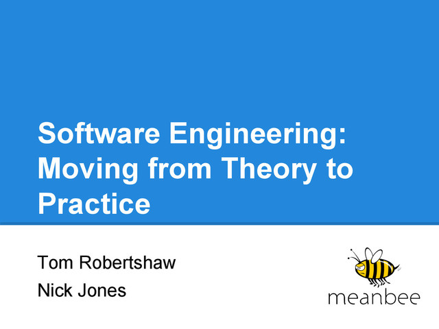 This presentation was given in 2013 to first year Computer Scientists at the University of Bath. The aim was to supplement the theory of what students were learning on their software engineering module with that of our experience at Meanbee after a couple of years in the 'real world'.