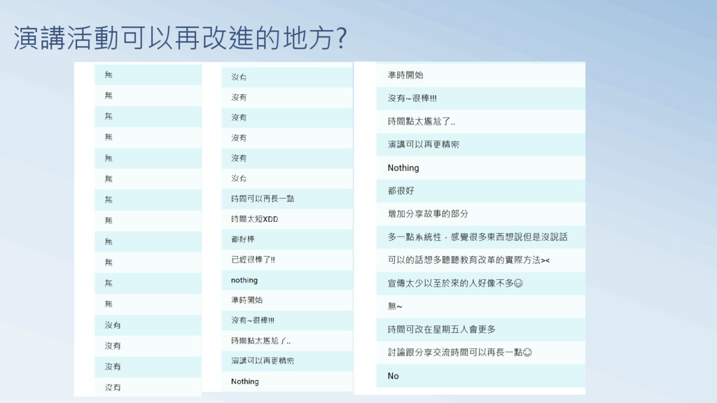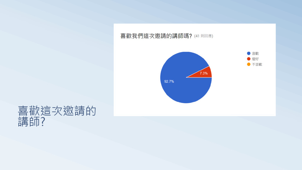 1 活動地點適當 34人 10人 5人 0人 0人 2 活動時間恰當 36人 2人 11人 0人 0人 3 喜歡這次邀請的講師 43人 3人 4人 0人 0人 4 喜歡這次的主題 39人 5人 5人 0人 0人 問題編號 問題內容 平均值 1 活動地點適當 滿意度4.6 2 活動時間恰當 滿意度4.5 3 喜歡這次邀請的講師 滿意度4.8 4 喜歡這次的主題 滿意度4.7 滿意度總平均值為4.65