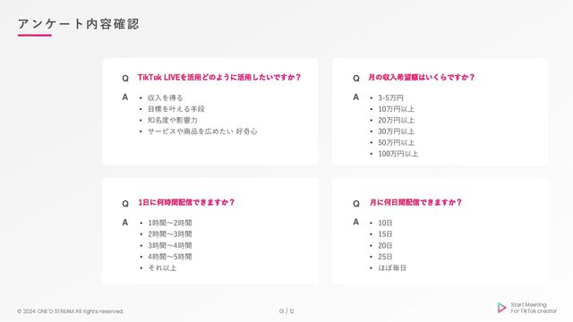 ス ス タ ー レ ジ ェ ン ド 目標収益 3〜5万円 10〜20万円 30〜50万円 80〜120万円 150万円〜 日数 (1ヶ月) 10日 20日 22日 26日 ENT 時間 (1ヶ月) 40時間 80時間 100時間 120時間 ENT トラックボーナス (6ヶ月) 月に7日15時間 以上 月に7日15時間 以上 月に7日15時間 以上 月に7日15時間 以上 月に7日15時間 以上 おすすめ © 2024 ONE‘D STREAM All rights reserved. 03 / 12 Start Meeting For TikTok creator LIVE INDEX