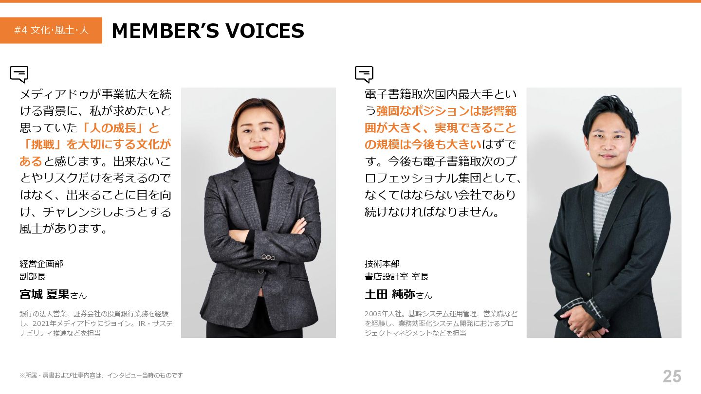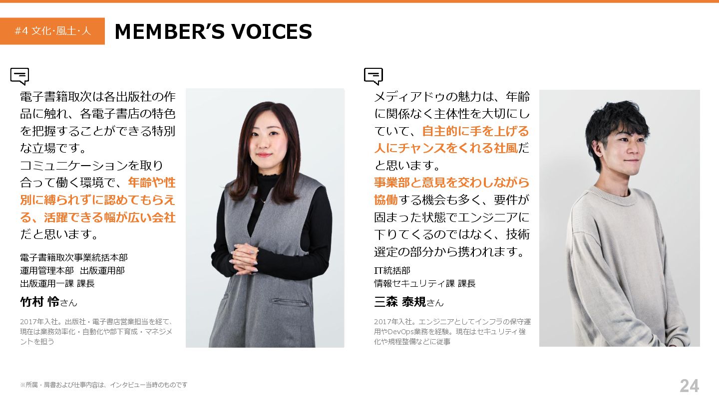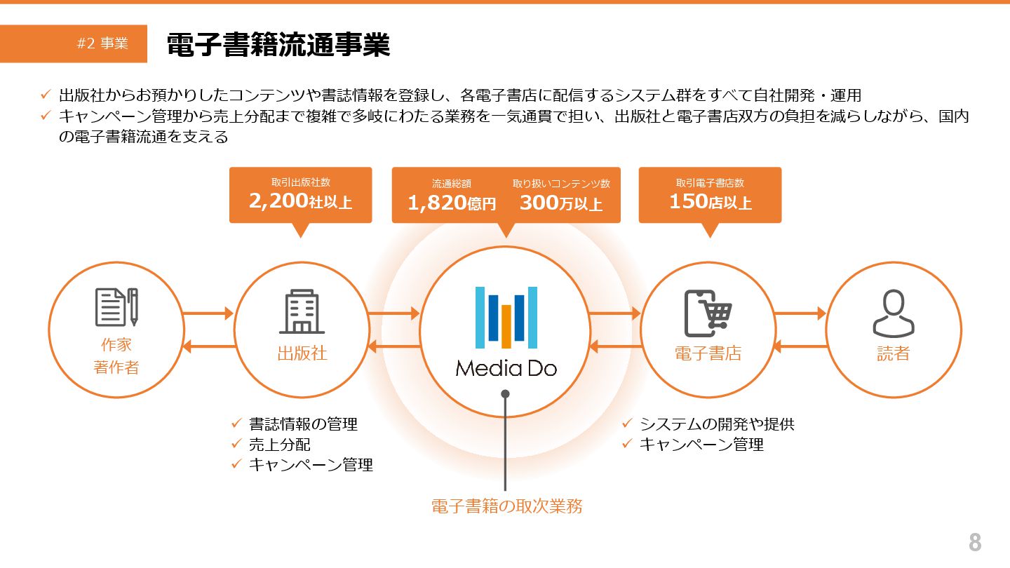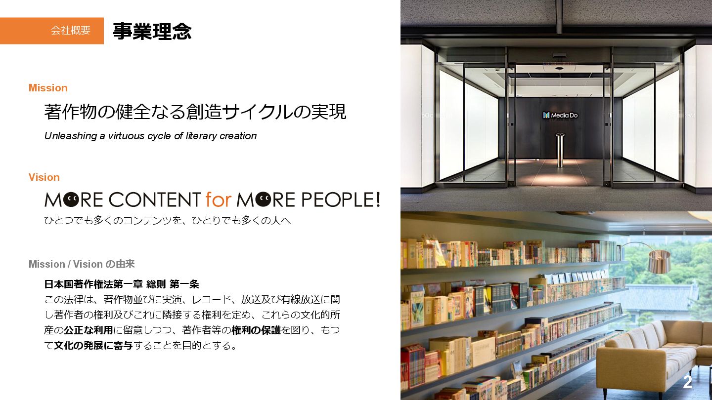 電子書籍流通を支える、株式会社メディアドゥの採用ピッチ資料です。 私たちは「MORE CONTENT FOR MORE PEOPLE!」(ひとつでも多くのコンテンツを、ひとりでも多くの人へ届けること)を事業ミッションに掲げ、日々、様々な挑戦をしています。 共に成長し、お互いへのリスペクトを大切にできる方を歓迎します。