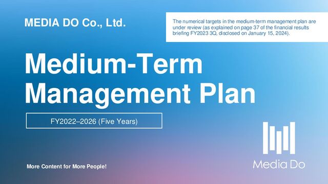 DO Co., Ltd. Medium – Term Management Plan FY2022-2026 (Five Years) Medium-Term Management Plan FY2022–2026 (Five Years) MEDIA DO Co., Ltd. More Content for More People! The numerical targets in the medium-term management plan are under review (as explained on page 37 of the financial results briefing FY2023 3Q, disclosed on January 15, 2024).