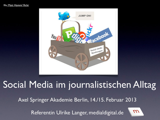 Ein Foliensatz, der erklärt, welche Plattformen und Strategien für Journalisten nützlich und erfolgversprechend sind. Ich habe diese Folien im Februar 2013 bei einem 2-Tages-Seminar für Volontäre an der Axel Springer Akademie in Berlin eingesetzt.
