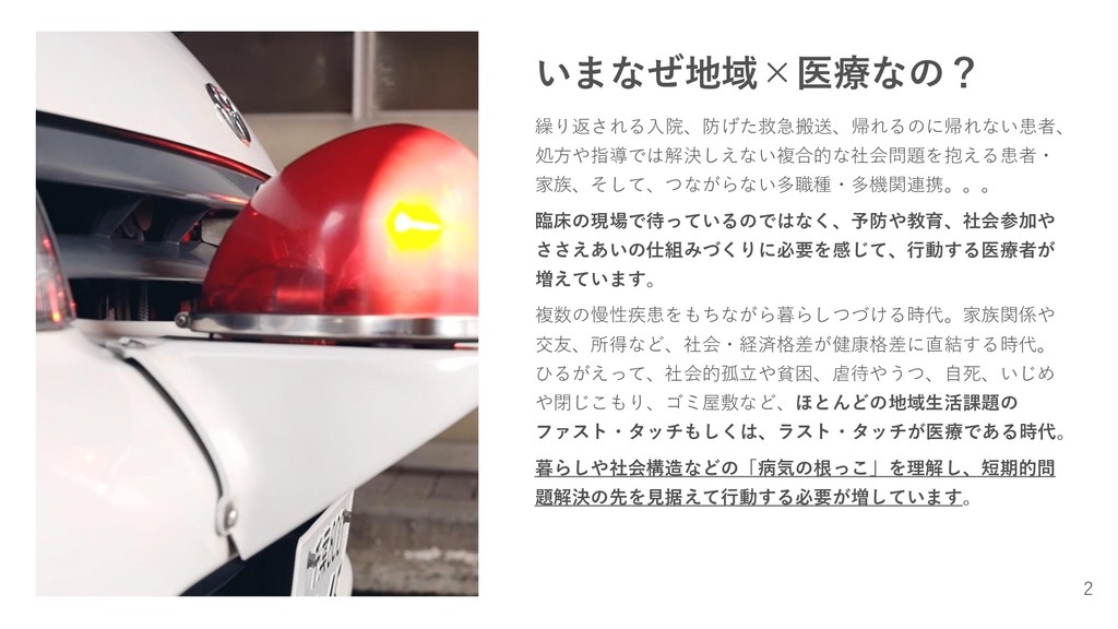 や閉じこもり、ゴミ屋敷など、ほとんどの地域生活課題の ファスト・タッチもしくは、ラスト・タッチが医療である時代。 暮らしや社会構造などの「病気の根っこ」を理解し、短期的問 題解決の先を見据えて行動する必要が増しています。 2