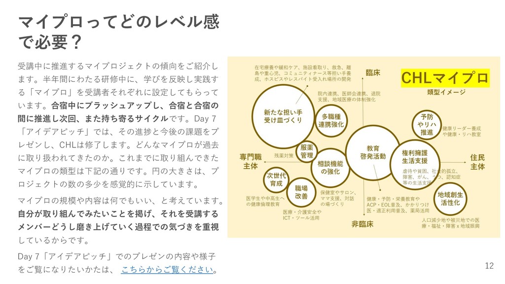 マイプロってどのレベル感 で必要? 受講中に推進するマイプロジェクトの傾向をご紹介し ます。半年間にわたる研修中に、学びを反映し実践す る「マイプロ」を受講者それぞれに設定してもらって います。合宿中にブラッシュアップし、合宿と合宿の 間に推進し次回、また持ち寄るサイクルです。Day 7 「アイデアピッチ」では、その進捗と今後の課題をプ レゼンし、CHLは修了します。どんなマイプロが過去