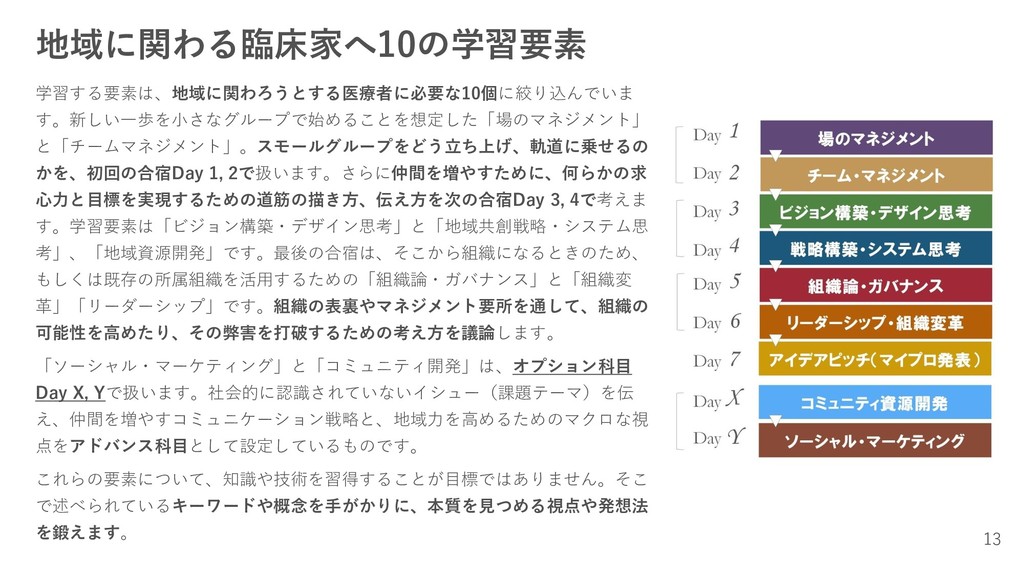 地域に関わる臨床家へ10の学習要素 学習する要素は、地域に関わろうとする医療者に必要な10個に絞り込んでいま す。新しい一歩を小さなグループで始めることを想定した「場のマネジメント」 と「チームマネジメント」。スモールグループをどう立ち上げ、軌道に乗せるの かを、初回の合宿Day 1, 2で扱います。さらに仲間を増やすために、何らかの求 心力と目標を実現するための道筋の描き方、伝え方を次の合宿Day 3, 4で考えま