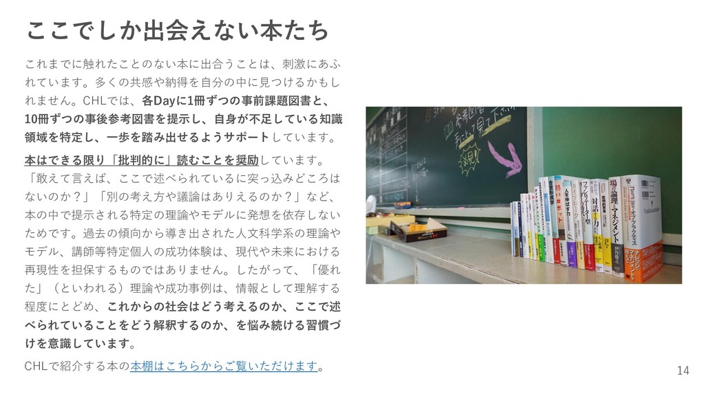 ここでしか出会えない本たち これまでに触れたことのない本に出合うことは、刺激にあふ れています。多くの共感や納得を自分の中に見つけるかもし れません。CHLでは、各Dayに1冊ずつの事前課題図書と、 10冊ずつの事後参考図書を提示し、自身が不足している知識 領域を特定し、一歩を踏み出せるようサポートしています。 本はできる限り「批判的に」読むことを奨励しています。 「敢えて言えば、ここで述べられているに突っ込みどころは ないのか?」「別の考え方や議論はありえるのか?」など、 本の中で提示される特定の理論やモデルに発想を依存しない