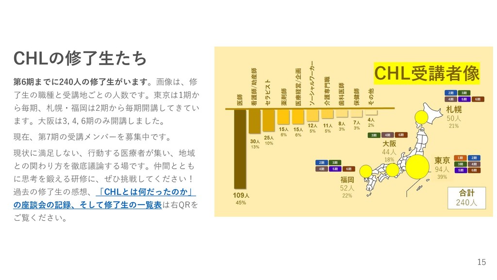 CHLの修了生たち 第6期までに240人の修了生がいます。画像は、修 了生の職種と受講地ごとの人数です。東京は1期か ら毎期、札幌・福岡は2期から毎期開講してきてい ます。大阪は3, 4, 6期のみ開講しました。 現在、第7期の受講メンバーを募集中です。 現状に満足しない、行動する医療者が集い、地域 との関わり方を徹底議論する場です。仲間ととも