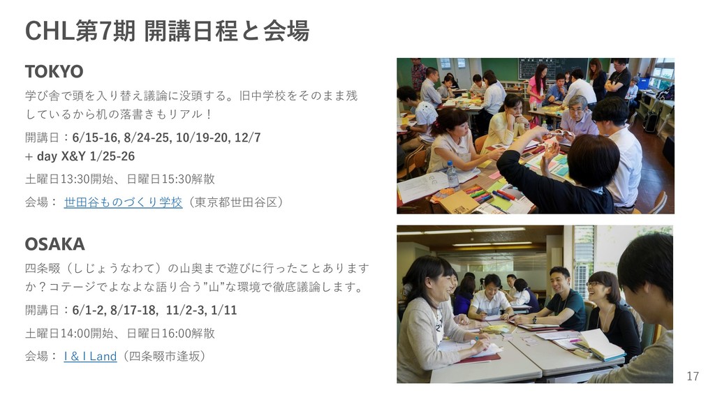 CHL第7期 開講日程と会場 TOKYO 学び舎で頭を入り替え議論に没頭する。旧中学校をそのまま残 しているから机の落書きもリアル! 開講日:6/15-16, 8/24-25, 10/19-20, 12/7 +