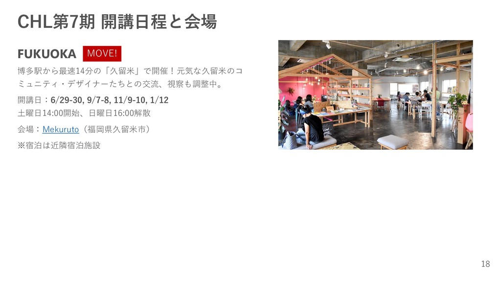 会場:Mekuruto(福岡県久留米市) ※宿泊は近隣宿泊施設 18 MOVE!