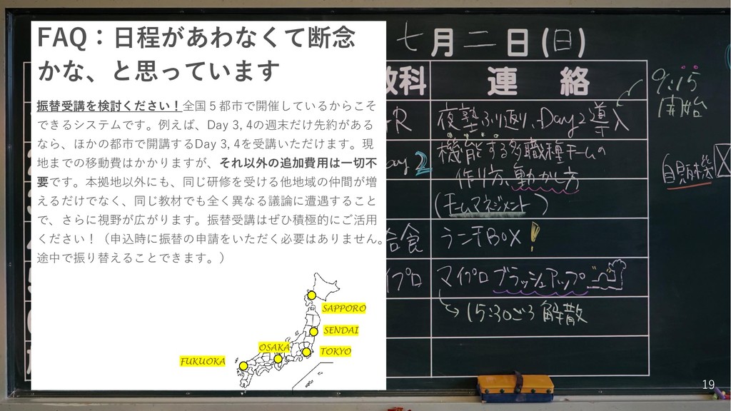 FAQ:日程があわなくて断念 かな、と思っています 振替受講を検討ください!全国5都市で開催しているからこそ できるシステムです。例えば、Day 3, 4の週末だけ先約がある なら、ほかの都市で開講するDay 3, 4を受講いただけます。現 地までの移動費はかかりますが、それ以外の追加費用は一切不
