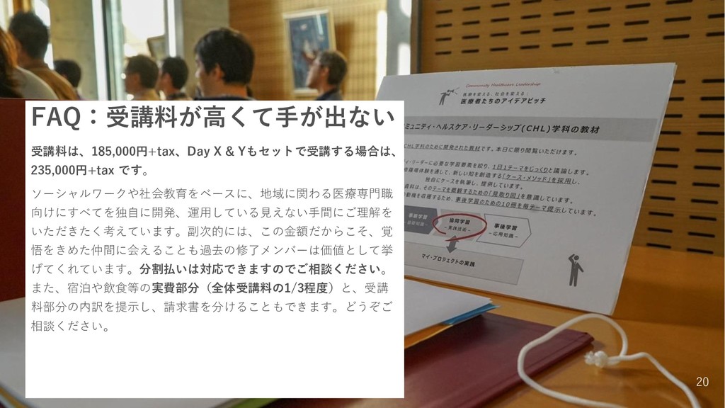 FAQ:受講料が高くて手が出ない 受講料は、185,000円+tax、Day X & Yもセットで受講する場合は、 235,000円+tax です。 ソーシャルワークや社会教育をベースに、地域に関わる医療専門職 向けにすべてを独自に開発、運用している見えない手間にご理解を いただきたく考えています。副次的には、この金額だからこそ、覚