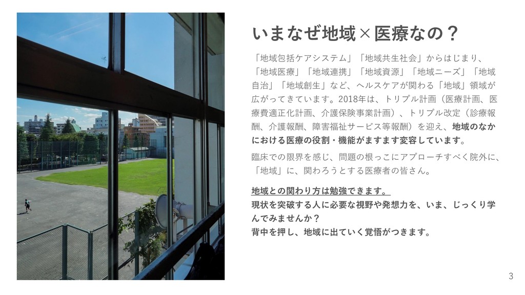 いまなぜ地域×医療なの? 「地域包括ケアシステム」「地域共生社会」からはじまり、 「地域医療」「地域連携」「地域資源」「地域ニーズ」「地域 自治」「地域創生」など、ヘルスケアが関わる「地域」領域が 広がってきています。2018年は、トリプル計画(医療計画、医 療費適正化計画、介護保険事業計画)、トリプル改定(診療報 酬、介護報酬、障害福祉サービス等報酬)を迎え、地域のなか における医療の役割・機能がますます変容しています。 臨床での限界を感じ、問題の根っこにアプローチすべく院外に、 「地域」に、関わろうとする医療者の皆さん。