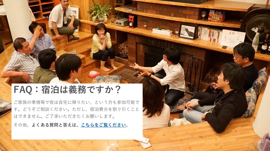 FAQ:宿泊は義務ですか? ご家族の事情等で夜は自宅に帰りたい、という方も参加可能で す。どうぞご相談ください。ただし、宿泊費分を割り引くこと はできません。ご了承いただきたくお願いします。 その他、よくある質問と答えは、こちらをご覧ください。 21