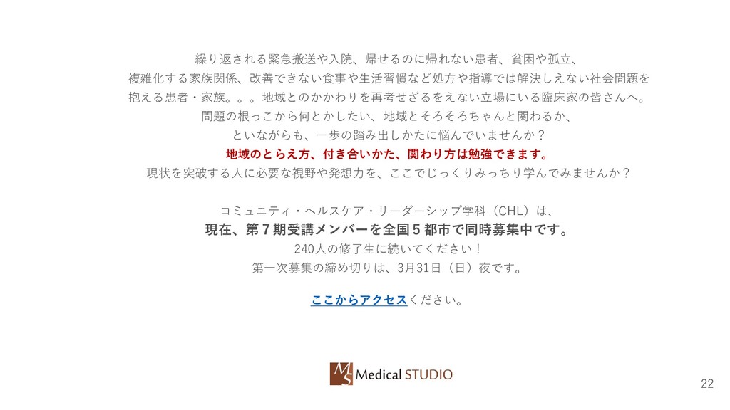 繰り返される緊急搬送や入院、帰せるのに帰れない患者、貧困や孤立、 複雑化する家族関係、改善できない食事や生活習慣など処方や指導では解決しえない社会問題を 抱える患者・家族。。。地域とのかかわりを再考せざるをえない立場にいる臨床家の皆さんへ。 問題の根っこから何とかしたい、地域とそろそろちゃんと関わるか、 といながらも、一歩の踏み出しかたに悩んでいませんか? 地域のとらえ方、付き合いかた、関わり方は勉強できます。 現状を突破する人に必要な視野や発想力を、ここでじっくりみっちり学んでみませんか? コミュニティ・ヘルスケア・リーダーシップ学科(CHL)は、 現在、第7期受講メンバーを全国5都市で同時募集中です。 240人の修了生に続いてください!