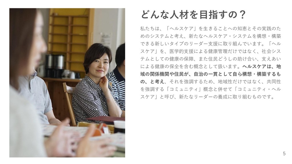 どんな人材を目指すの? 地域の力を引き出し、地域の暮らしをささえあう仕組みを発想 し、構築するための思考法や複数の解決法を持ちうる人材の育 成を目指しています。型にはまらず、医療者の“権威”を行使しな いしなやかなリーダー像を模索します。複雑で複層的な課題が 絡み合う現代社会において、状況に応じて柔軟に対応ができる こと、そして、住民が自治の一貫としてヘルスケアを考え行動 するために、住民が主役の仕組みを構想することが、これから の社会に必要だと考えるからです。 そのリーダーシップ・スタイルは、父権的なものではなく、地