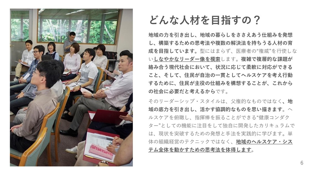 域の底力を引き出し、活かす協調的なものを思い描きます。ヘ ルスケアを俯瞰し、指揮棒を振ることができる“健康コンダク ター”としての機能に注目をして独自に開発したカリキュラムで は、現状を突破するための発想と手法を実践的に学びます。単 体の組織経営のテクニックではなく、地域のヘルスケア・シス テム全体を動かすための思考法を体得します。 6