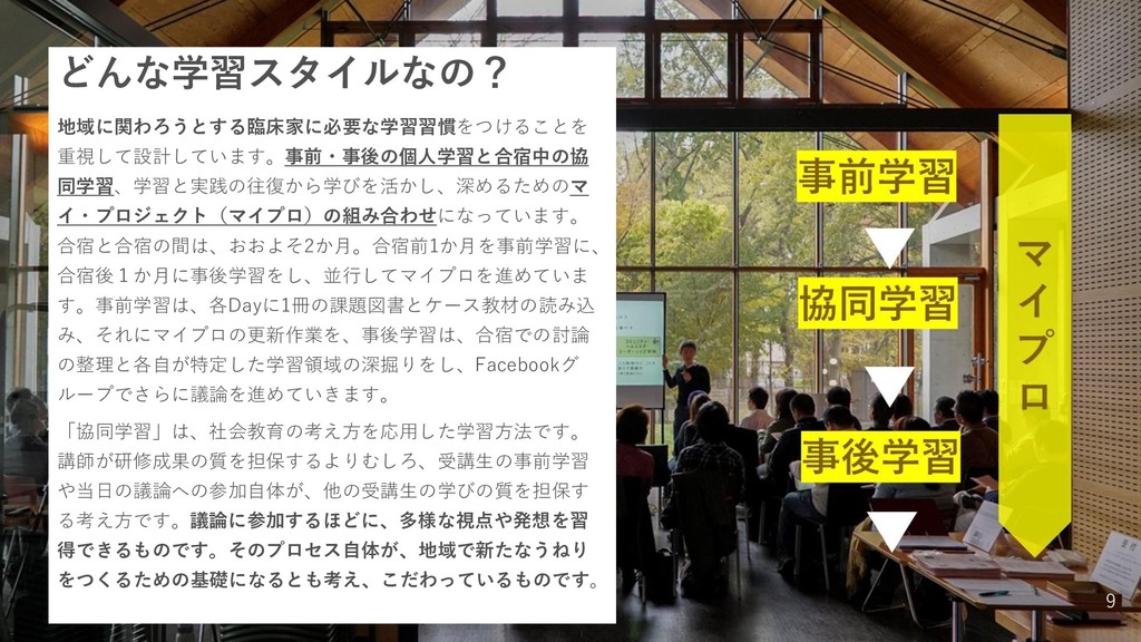 どんな学習スタイルなの? 地域に関わろうとする臨床家に必要な学習習慣をつけることを 重視して設計しています。事前・事後の個人学習と合宿中の協 同学習、学習と実践の往復から学びを活かし、深めるためのマ イ・プロジェクト(マイプロ)の組み合わせになっています。 合宿と合宿の間は、おおよそ2か月。合宿前1か月を事前学習に、 合宿後1か月に事後学習をし、並行してマイプロを進めていま す。事前学習は、各Dayに1冊の課題図書とケース教材の読み込 み、それにマイプロの更新作業を、事後学習は、合宿での討論 の整理と各自が特定した学習領域の深掘りをし、Facebookグ