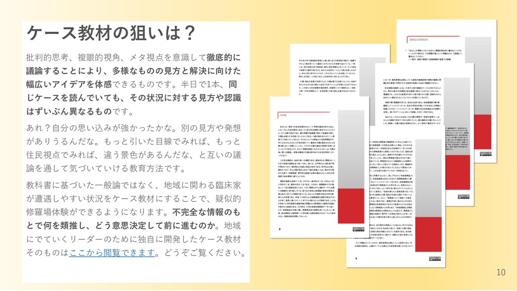 教科書に基づいた一般論ではなく、地域に関わる臨床家 が遭遇しやすい状況をケース教材にすることで、疑似的 修羅場体験ができるようになります。不完全な情報のも とで何を類推し、どう意思決定して前に進むのか。地域 にでていくリーダーのために独自に開発したケース教材 そのものはここから閲覧できます。どうぞご覧ください。 10