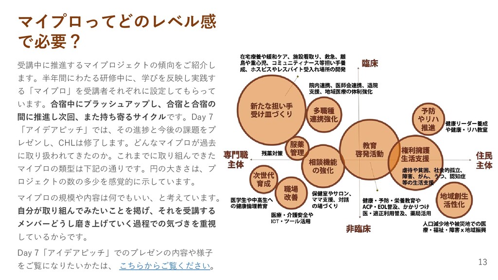 に取り扱われてきたのか。これまでに取り組んできた マイプロの類型は下記の通りです。円の大きさは、プ ロジェクトの数の多少を感覚的に示しています。 マイプロの規模や内容は何でもいい、と考えています。 自分が取り組んでみたいことを掲げ、それを受講する メンバーどうし磨き上げていく過程での気づきを重視 しているからです。 Day 7「アイデアピッチ」でのプレゼンの内容や様子 をご覧になりたいかたは、 こちらからご覧ください。 13