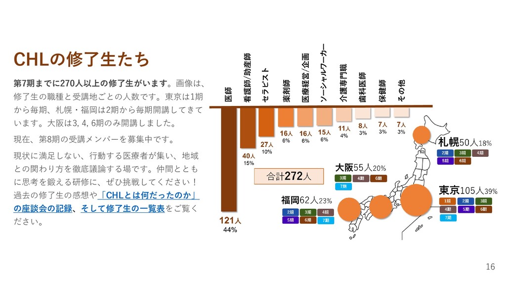CHLの修了生たち 第7期までに270人以上の修了生がいます。画像は、 修了生の職種と受講地ごとの人数です。東京は1期 から毎期、札幌・福岡は2期から毎期開講してきて います。大阪は3, 4, 6期のみ開講しました。 現在、第8期の受講メンバーを募集中です。 現状に満足しない、行動する医療者が集い、地域 との関わり方を徹底議論する場です。仲間ととも