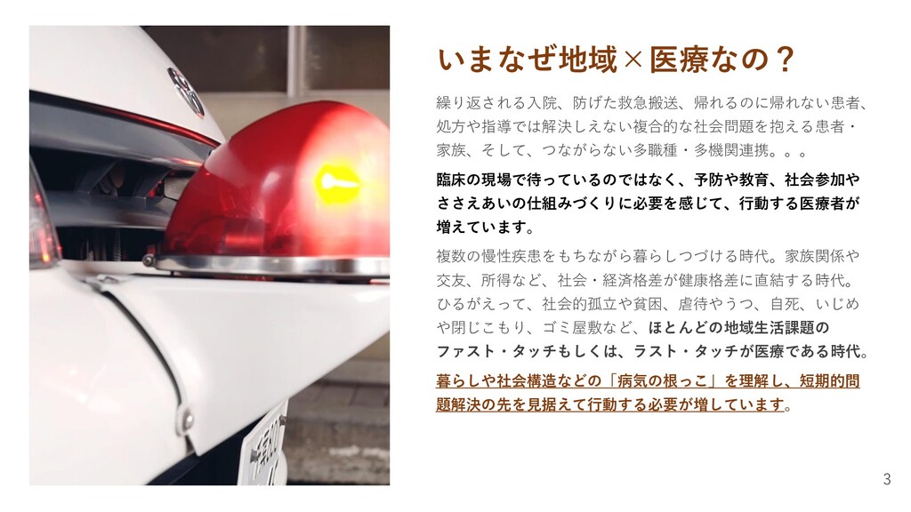や閉じこもり、ゴミ屋敷など、ほとんどの地域生活課題の ファスト・タッチもしくは、ラスト・タッチが医療である時代。 暮らしや社会構造などの「病気の根っこ」を理解し、短期的問 題解決の先を見据えて行動する必要が増しています。 3