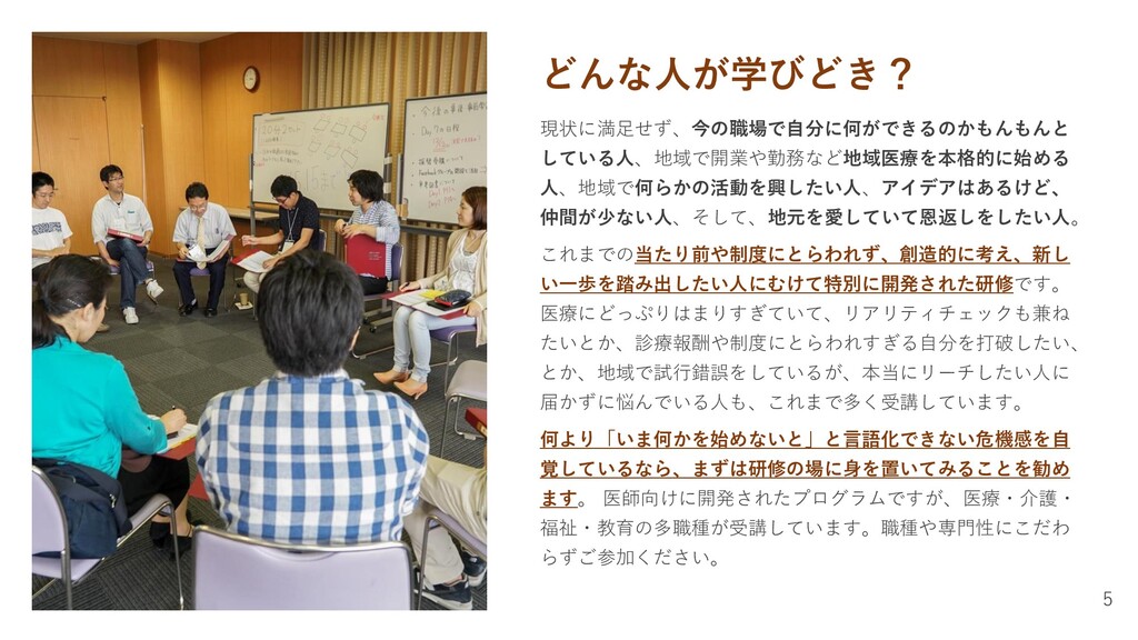 届かずに悩んでいる人も、これまで多く受講しています。 何より「いま何かを始めないと」と言語化できない危機感を自 覚しているなら、まずは研修の場に身を置いてみることを勧め ます。 医師向けに開発されたプログラムですが、医療・介護・ 福祉・教育の多職種が受講しています。職種や専門性にこだわ らずご参加ください。 5