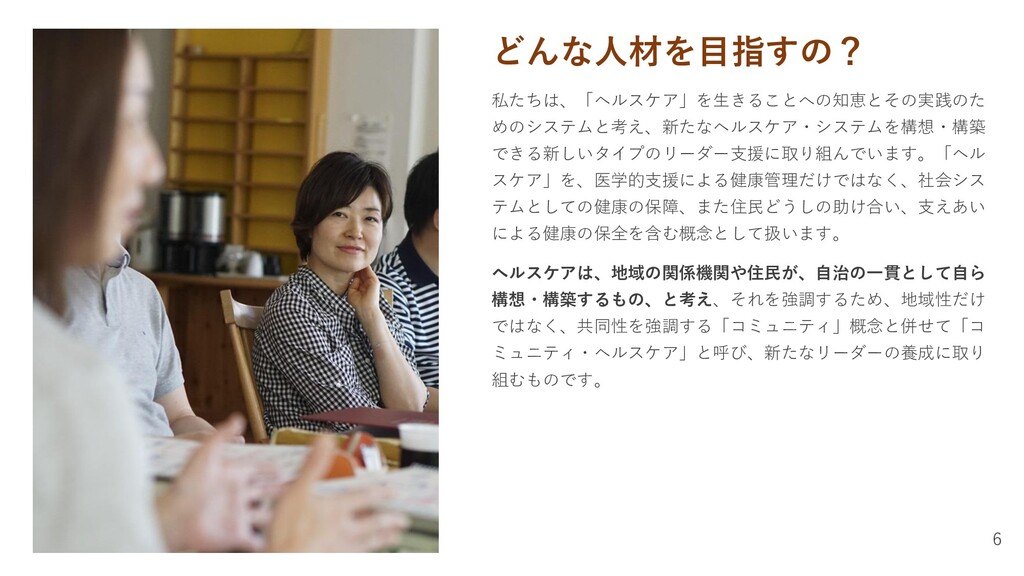 ミュニティ・ヘルスケア」と呼び、新たなリーダーの養成に取り 組むものです。 6