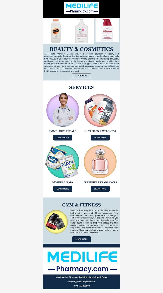 selection of beauty and cosmetics products, featuring top-tier skincare, haircare, and makeup essentials from trusted global brands. Whether you're looking for anti-aging solutions, nourishing hair treatments, or the latest in makeup trends, we provide high- quality products tailored to all skin and hair types. With a focus on safety and wellness, all our items are dermatologist-approved, ensuring you achieve the best results. Shop conveniently online, enjoy fast delivery, and embrace beauty that’s backed by expert care and trust. LEARN MORE SERVICES HOME - HEALTHCARE LEARN MORE NUTRITION & WELLNESS LEARN MORE MOTHER & BABY LEARN MORE PERFUMES & FRAGRANCES LEARN MORE GYM & FITNESS MediLife Pharmacy is your trusted destination for high-quality gym and fitness products. From supplements and protein powders to fitness gear and recovery essentials, we provide everything you need to support your health and fitness journey. Our expert team is here to help you choose the right products tailored to your goals, making it easier to stay active and reach your fitness potential. Visit MediLife Pharmacy to elevate your workout routine with premium fitness essentials LEARN MORE New Medilife Pharmacy, Building Material Mall, Dubai