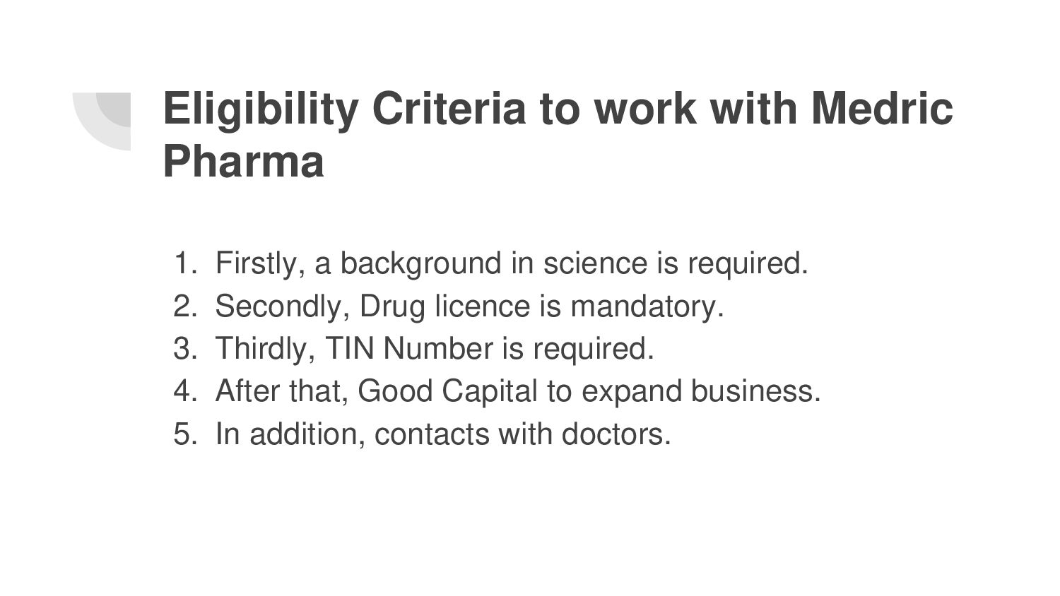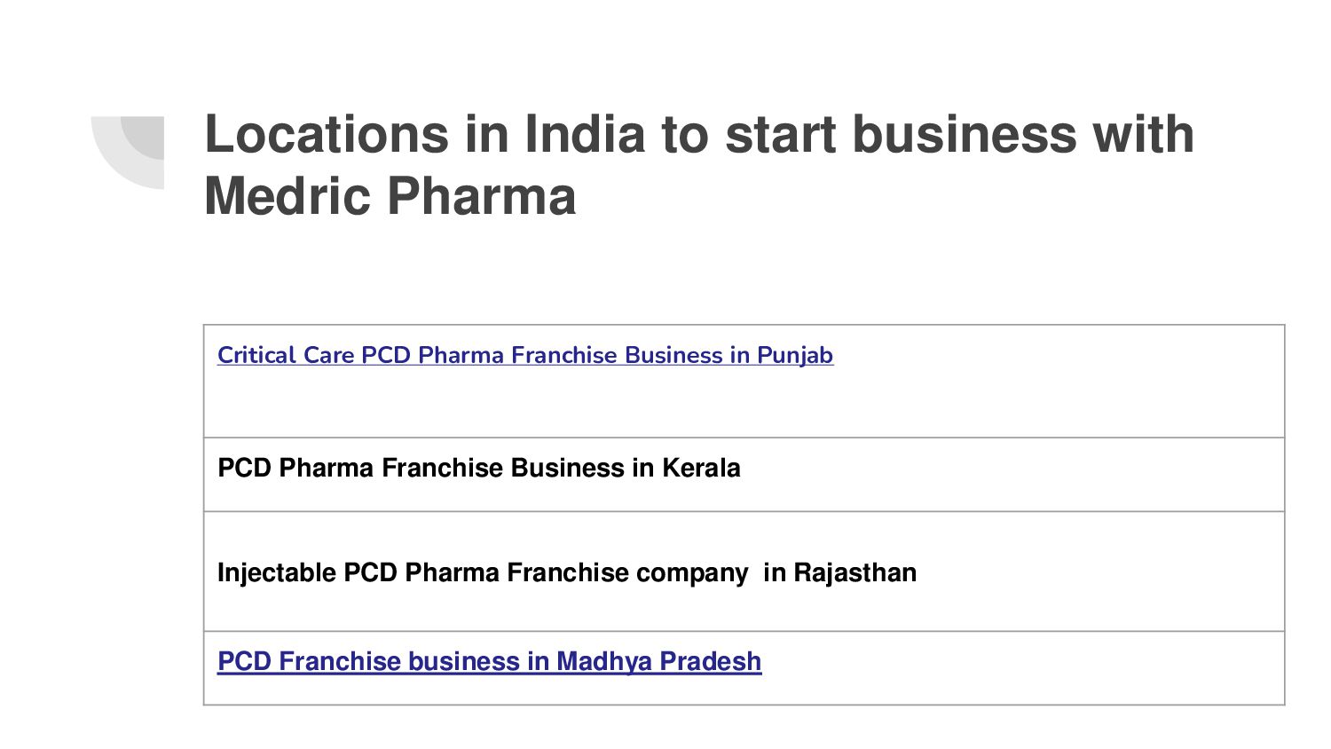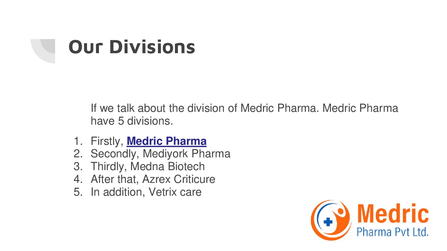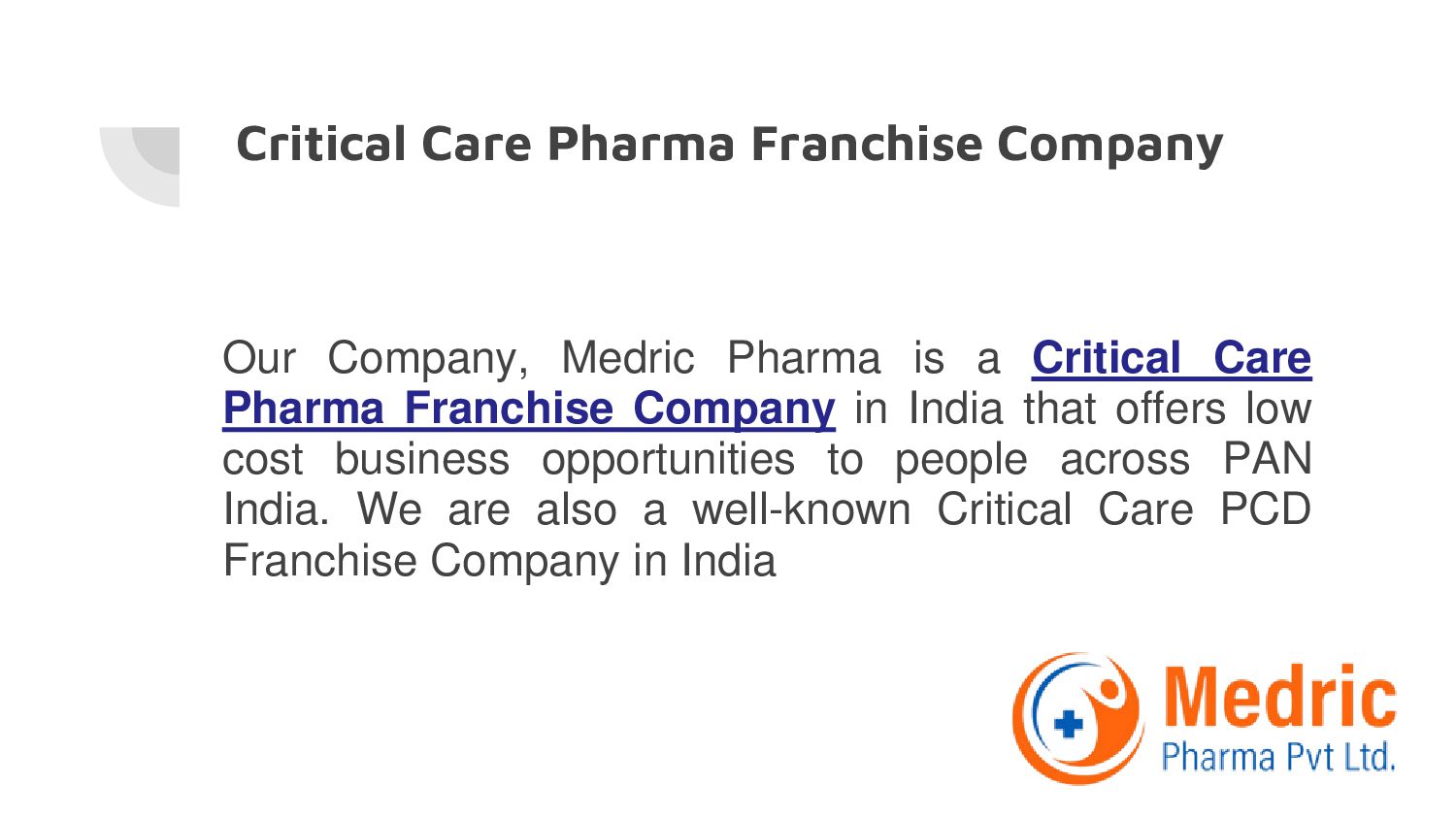 Medric Pharma is a Critical Care Pharma Franchise Company in India that offers low cost business opportunities to people across PAN India. We are also a well-known Critical Care PCD Franchise Company in India as well as other areas of PAN India. Contact Medric Pharma If you’re looking for PCD Franchise Company in Critical segments. in India or You can also reach out to us at: +91- 91388 00464.