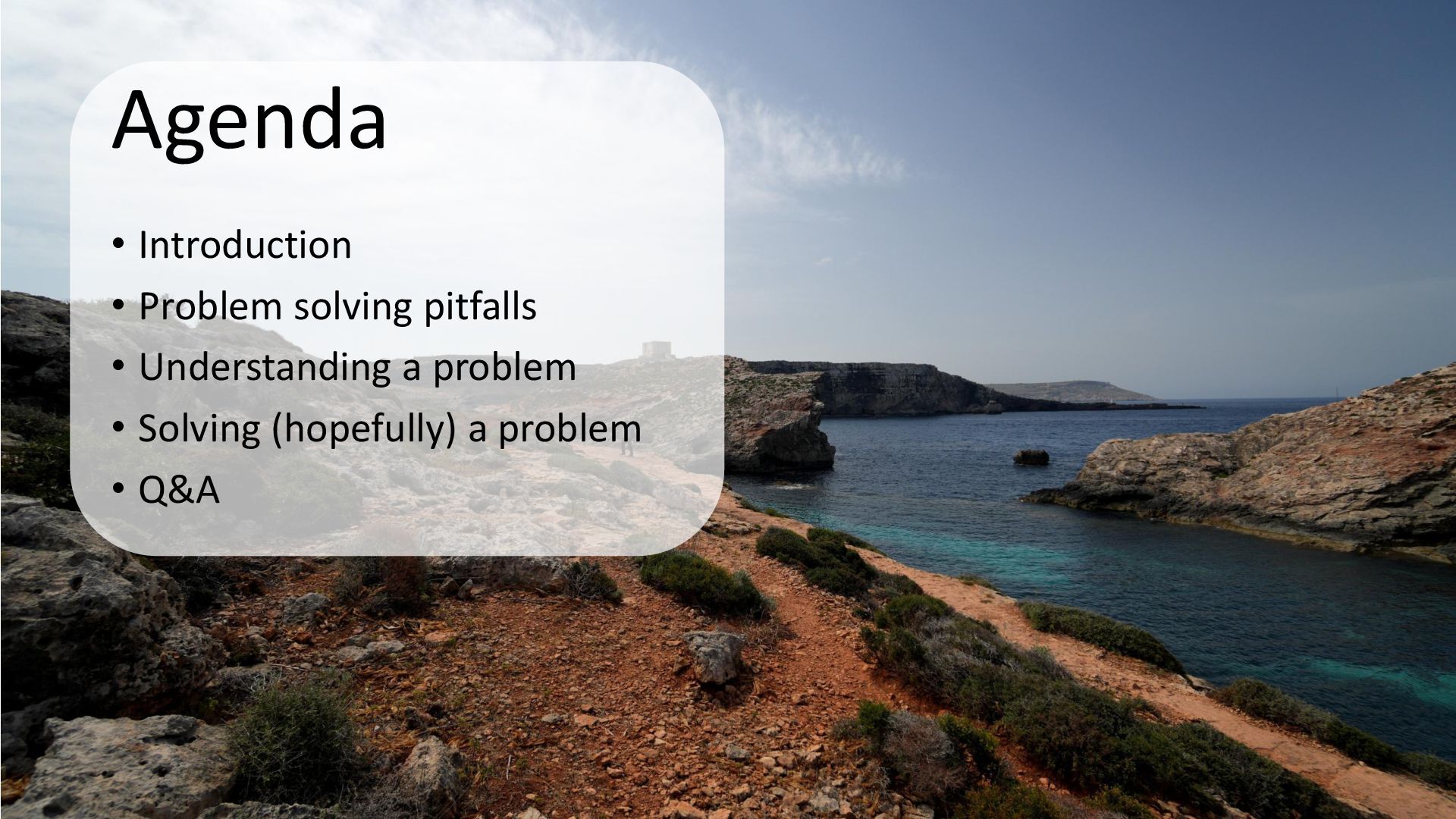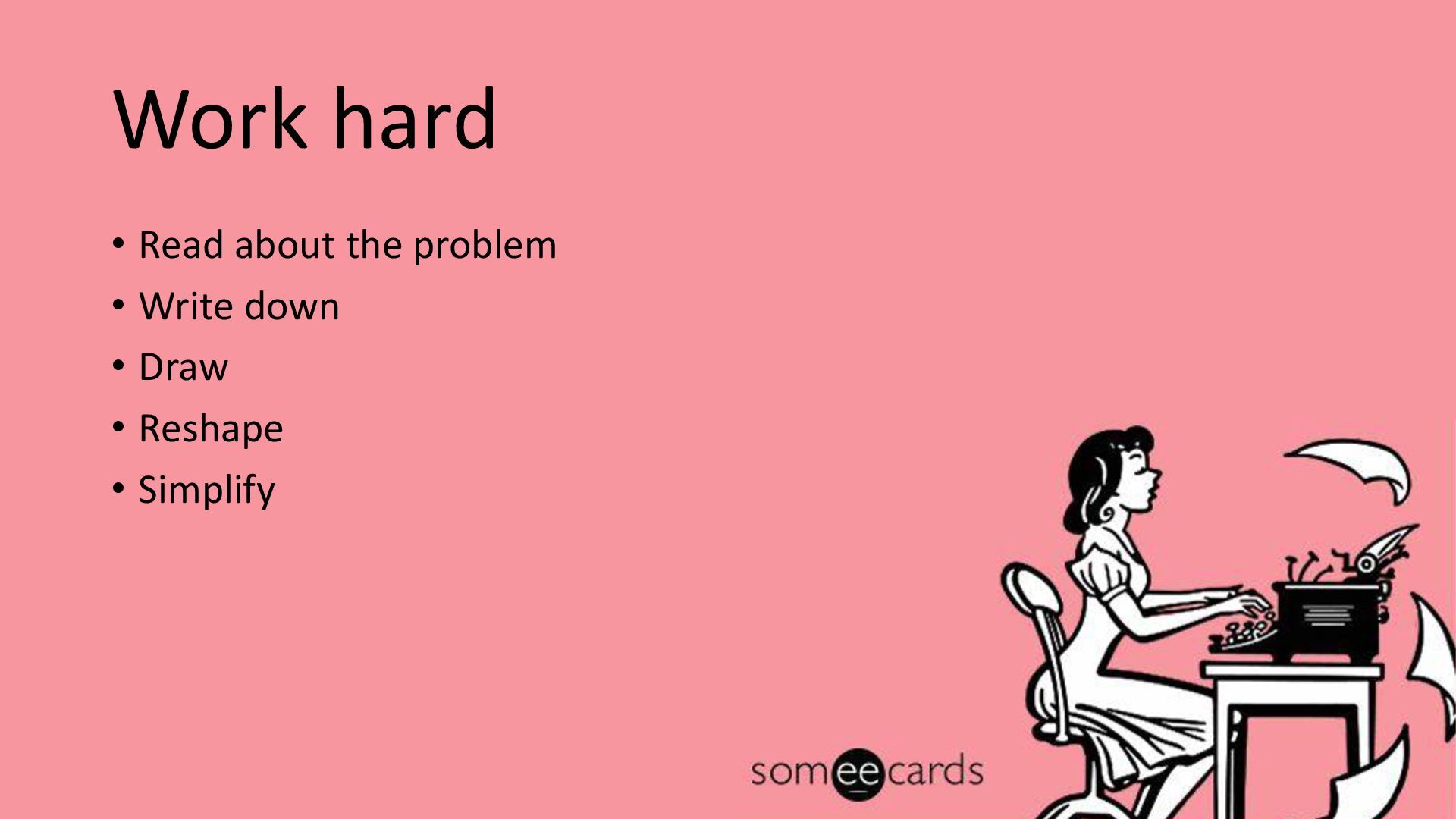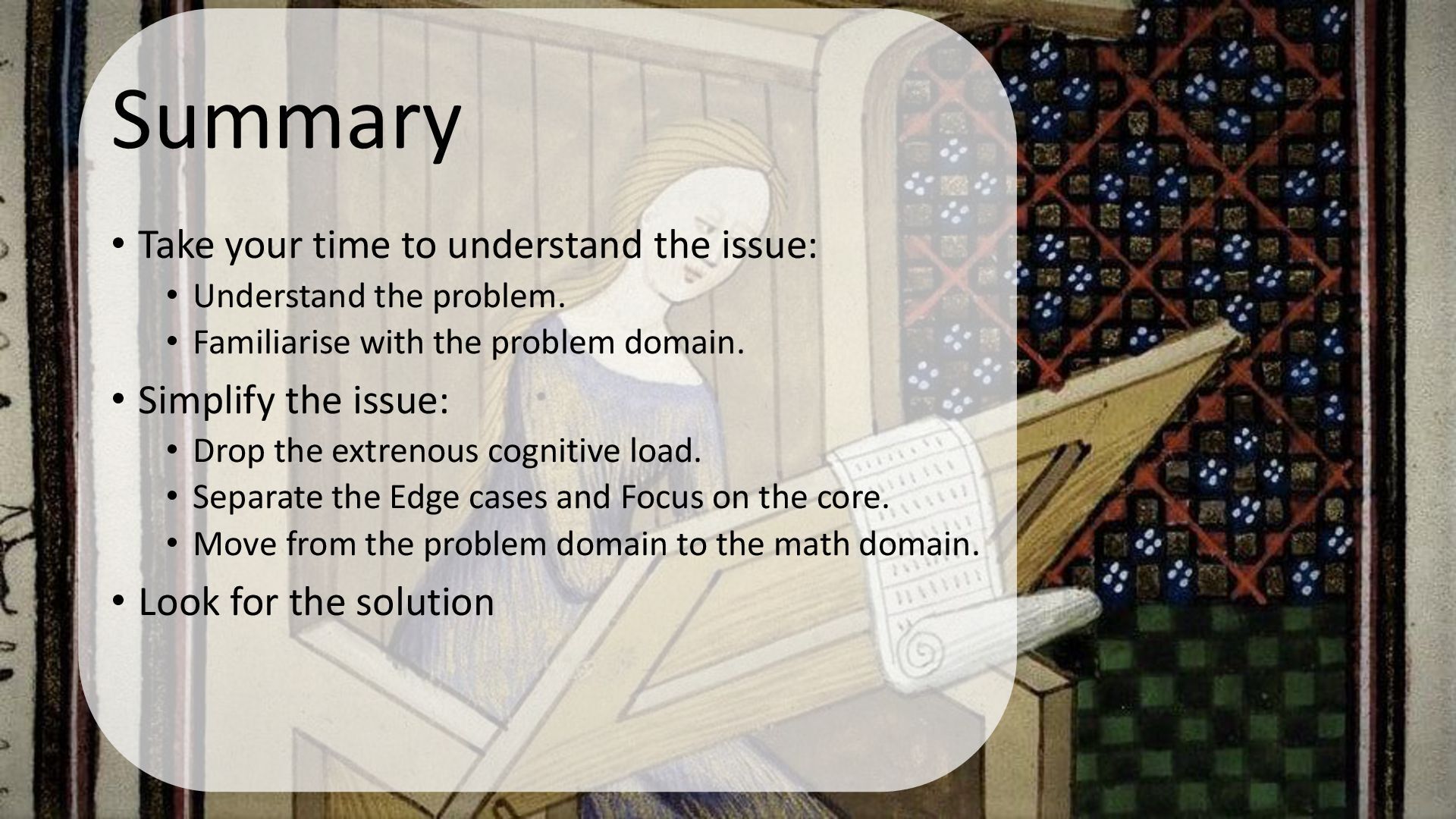 Understand the problem. • Familiarise with the problem domain. • Simplify the issue: • Drop the extrenous cognitive load. • Separate the Edge cases and Focus on the core. • Move from the problem domain to the math domain. • Look for the solution