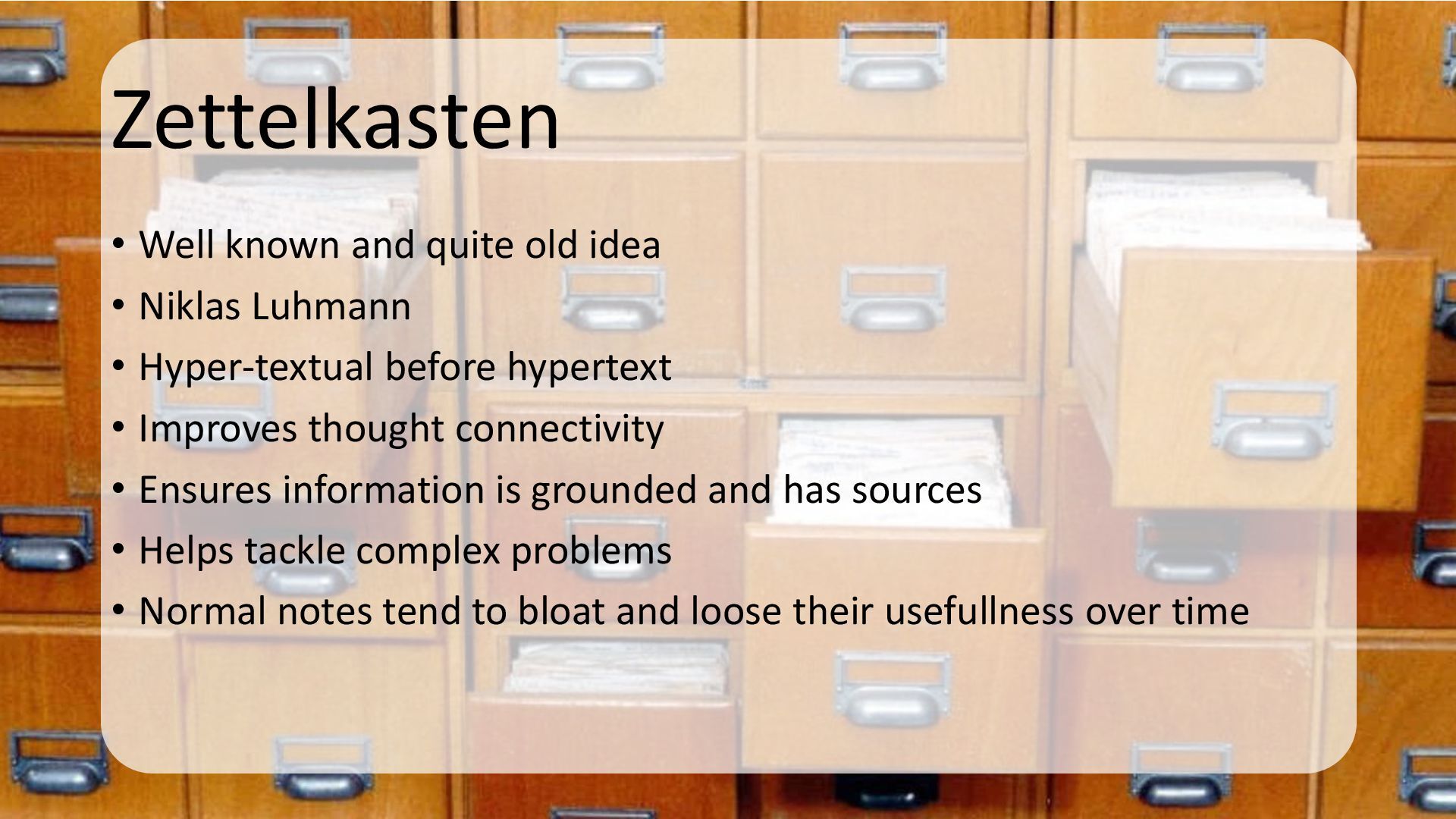 Luhmann • Hyper-textual before hypertext • Improves thought connectivity • Ensures information is grounded and has sources • Helps tackle complex problems • Normal notes tend to bloat and loose their usefullness over time