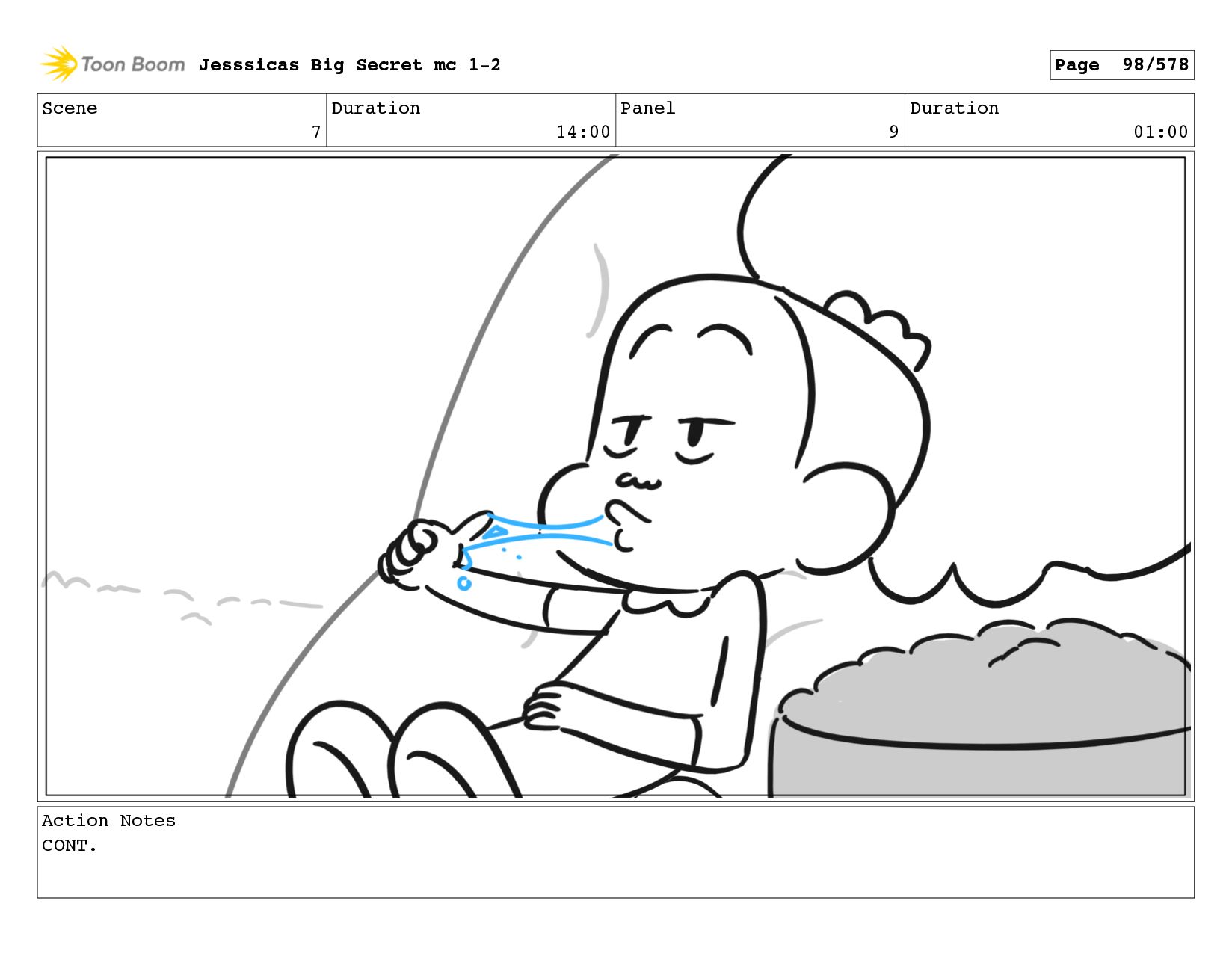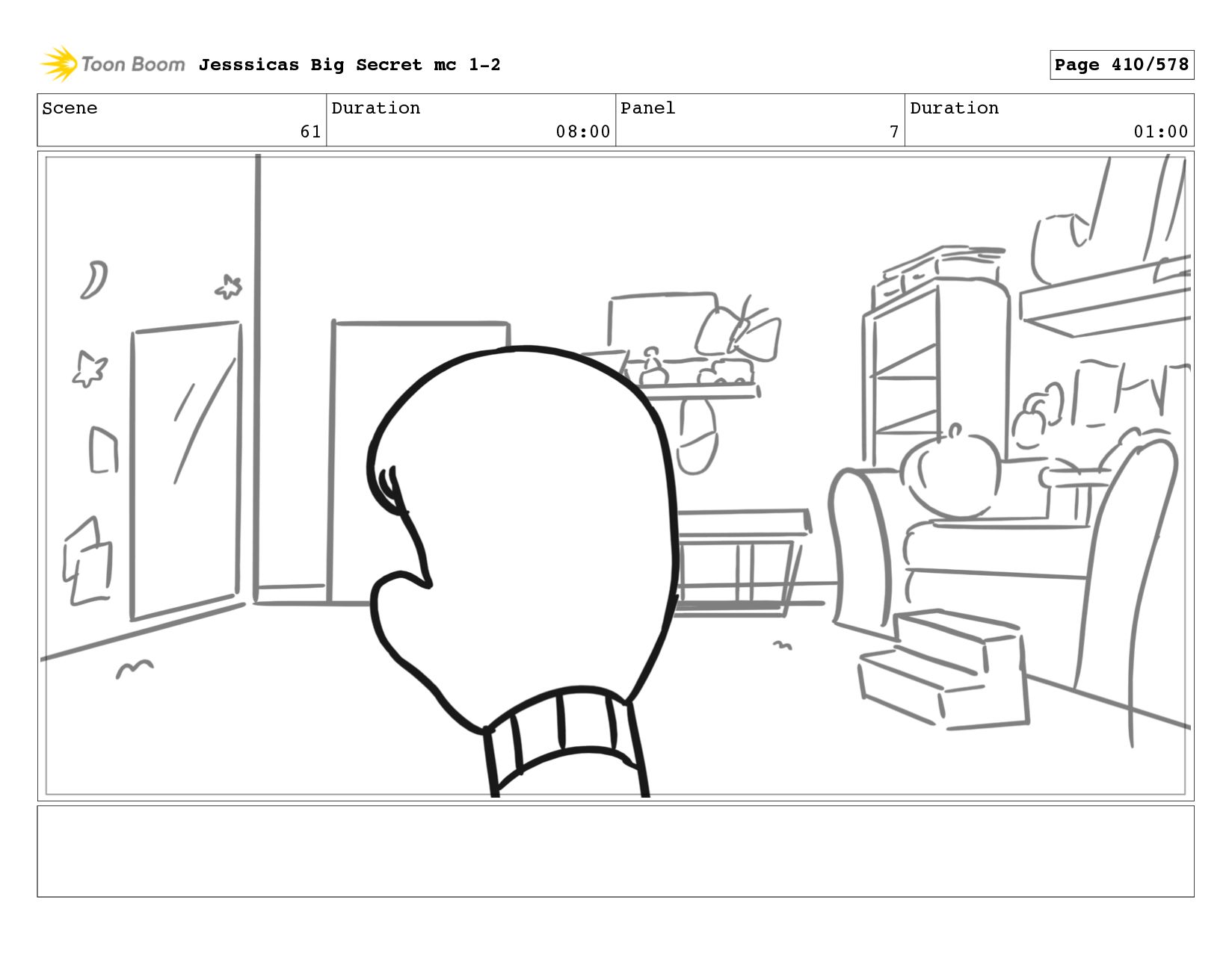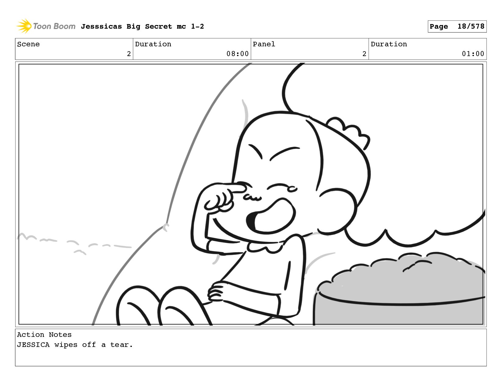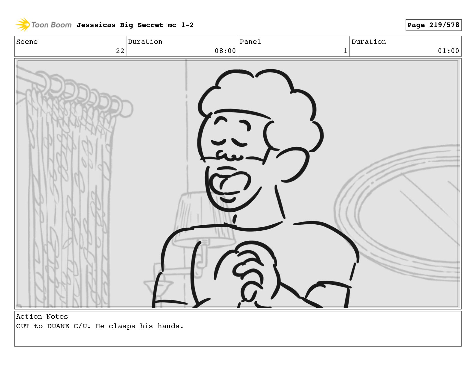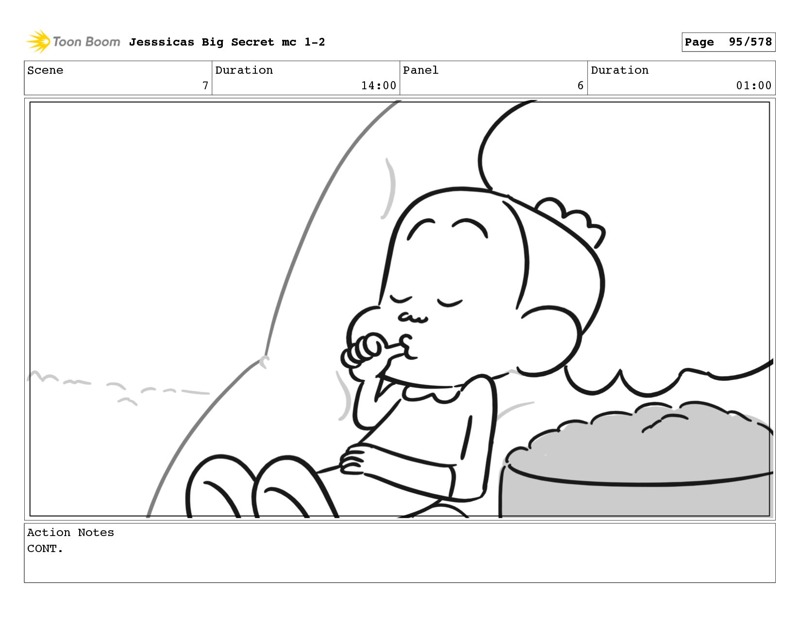 Scene 2 Duration 08:00 Panel 1 Duration 01:00 Action Notes
