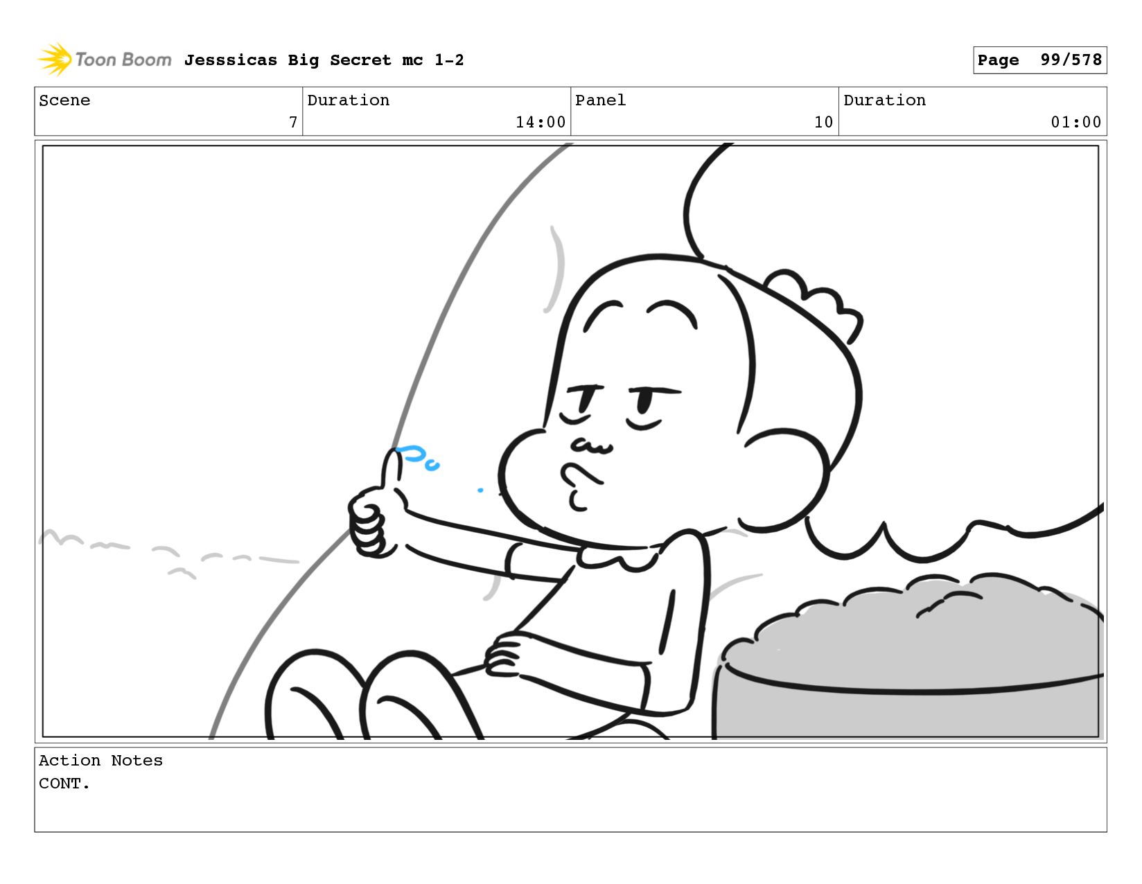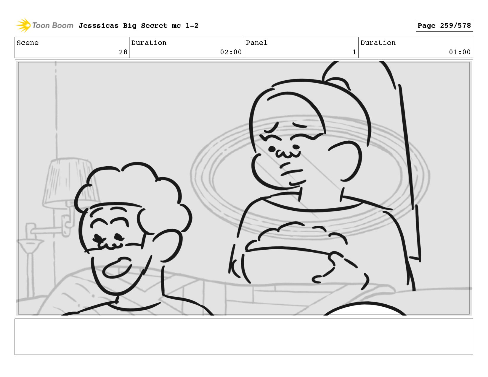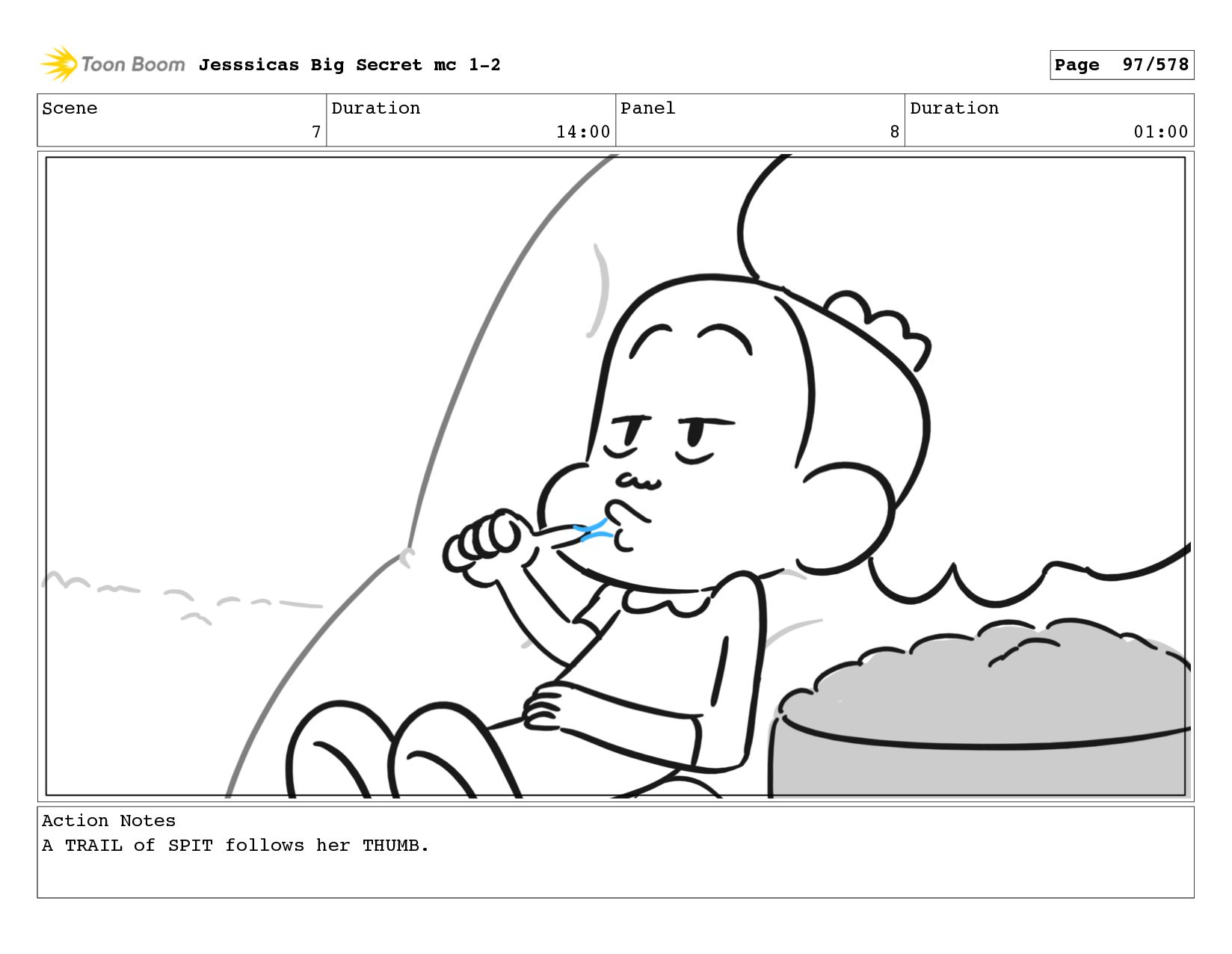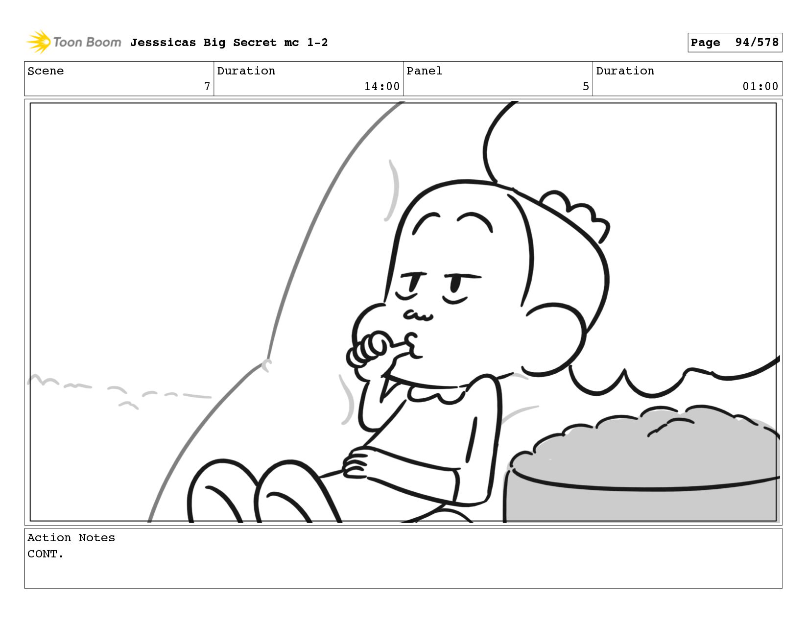 Scene 2 Duration 08:00 Panel 1 Duration 01:00 Action Notes