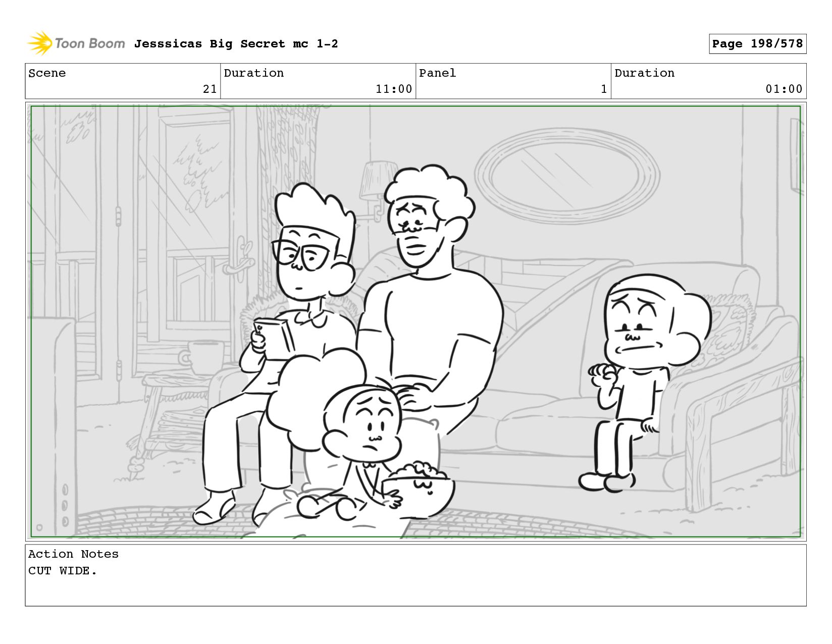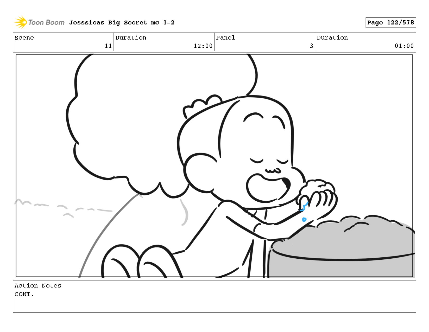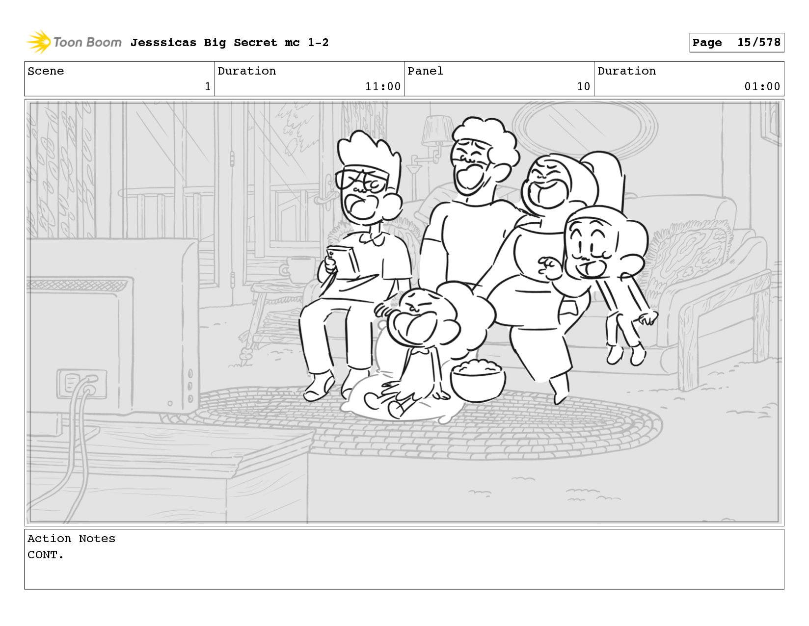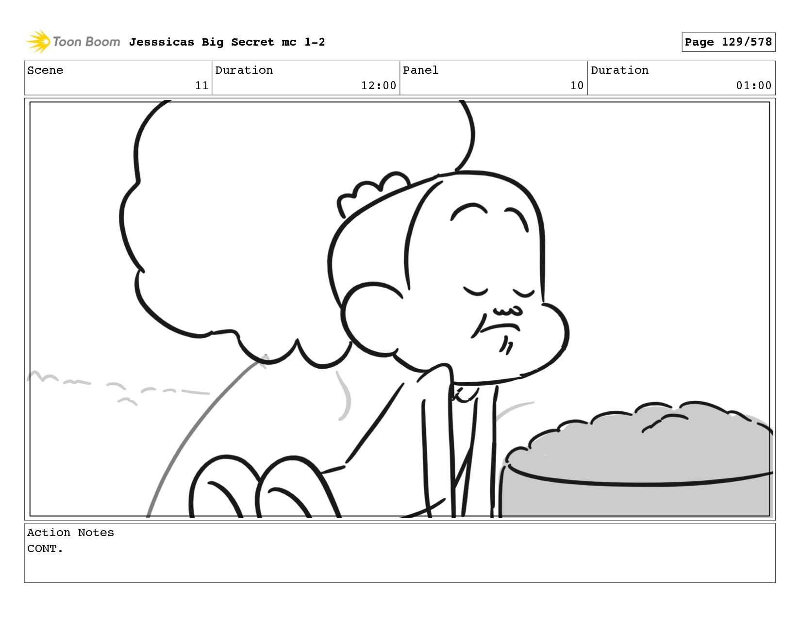 Scene 1 Duration 11:00 Panel 1 Duration 01:00 Action Notes