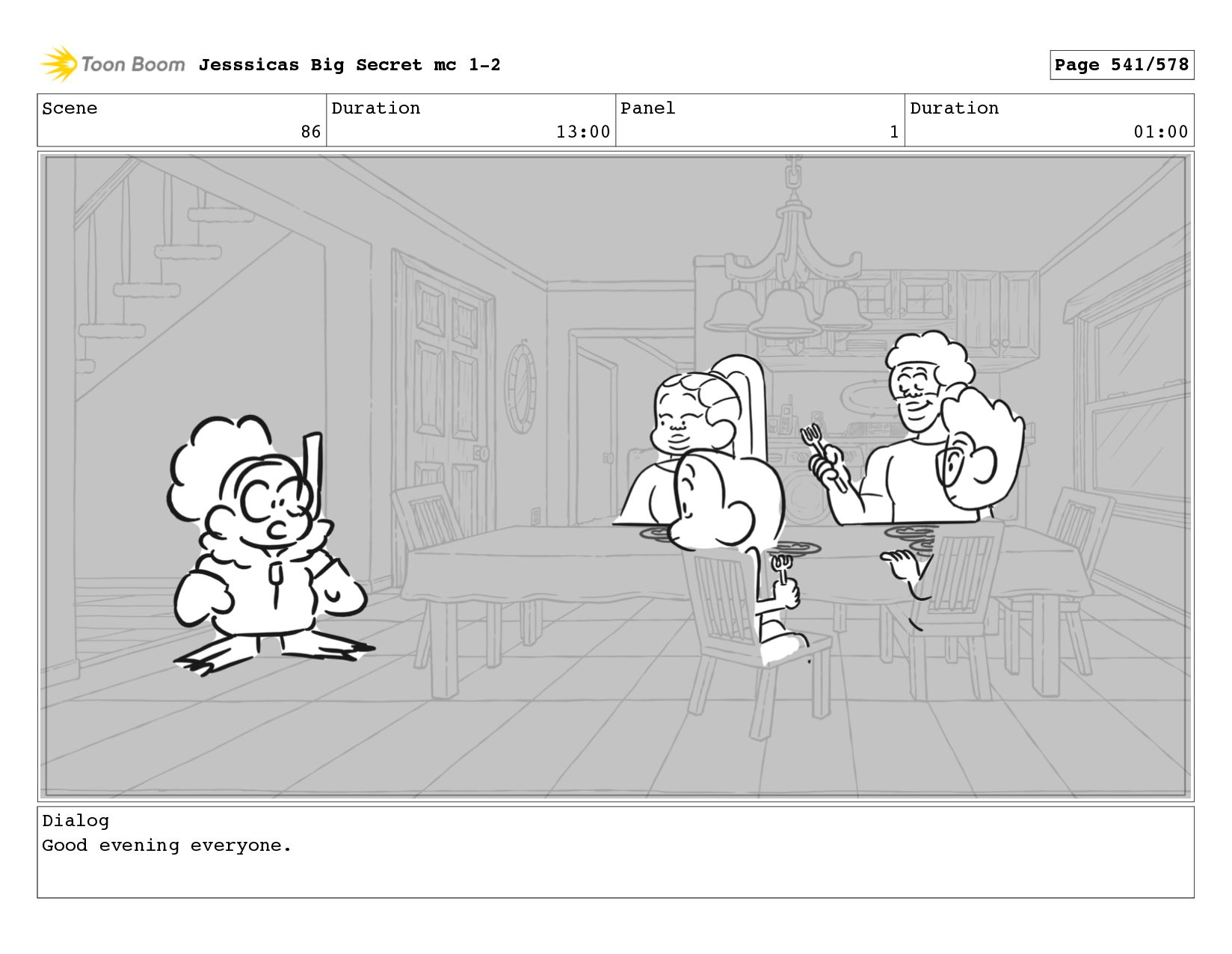 Scene 86 Duration 13:00 Panel 1 Duration 01:00 Dialog Good