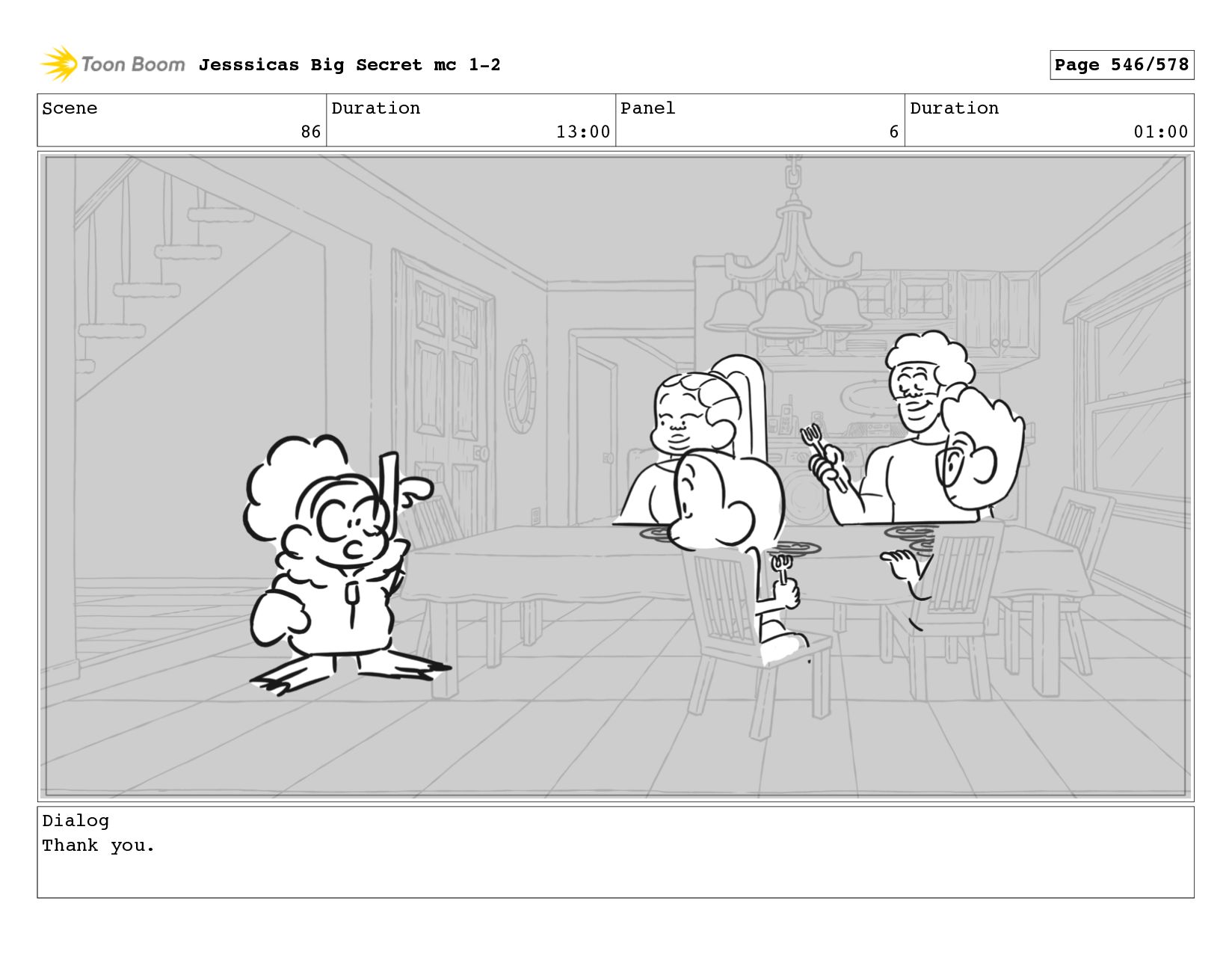 Scene 86 Duration 13:00 Panel 6 Duration 01:00 Dialog Thank