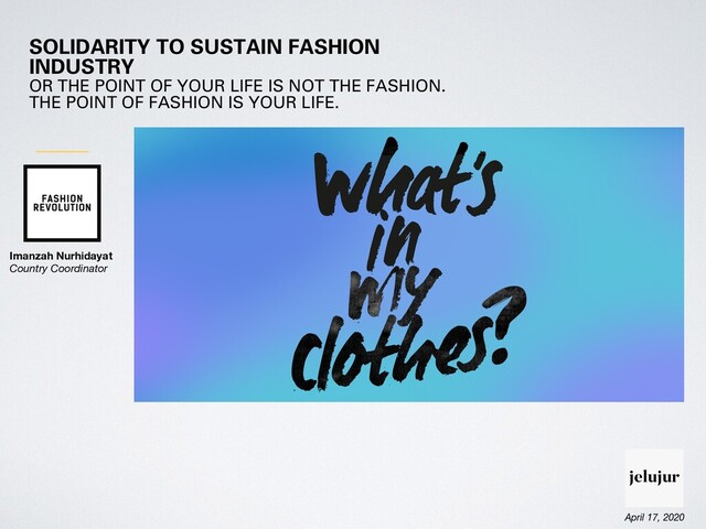 Sustainable fashion could no longer applied as way of living, shattered by COVID19 pandemic, stopped by no investment on global healthcare from anyone on the ecosystem. How can such industry like sustainable fashion be relevant again? We need to revalue it. Yet, we don't get that: the point of your life is not the fashion, the point of fashion is your life.