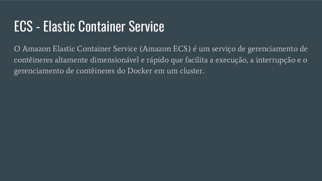 (Amazon ECS) é um serviço de gerenciamento de contêineres altamente dimensionável e rápido que facilita a execução, a interrupção e o gerenciamento de contêineres do Docker em um cluster.