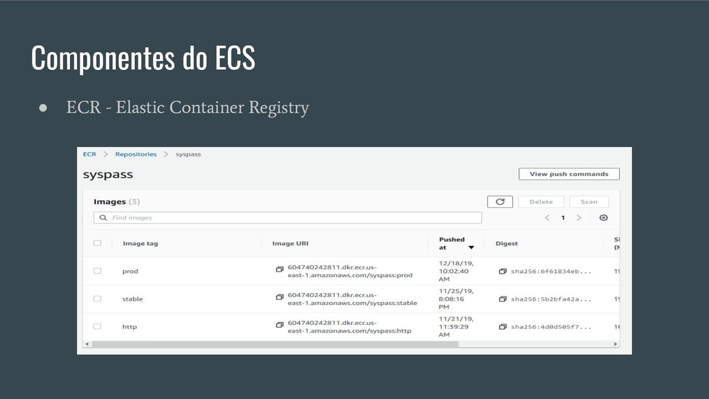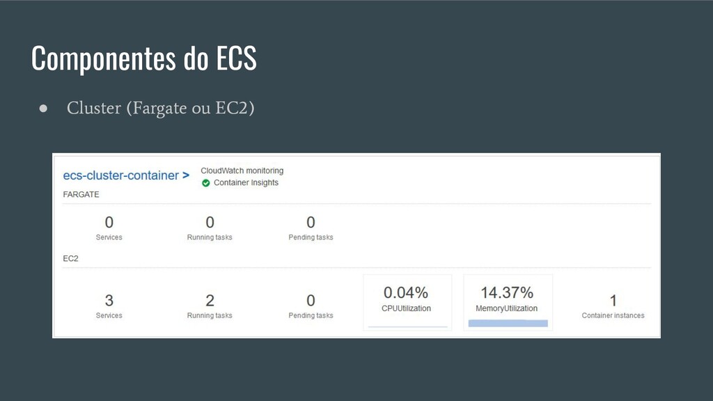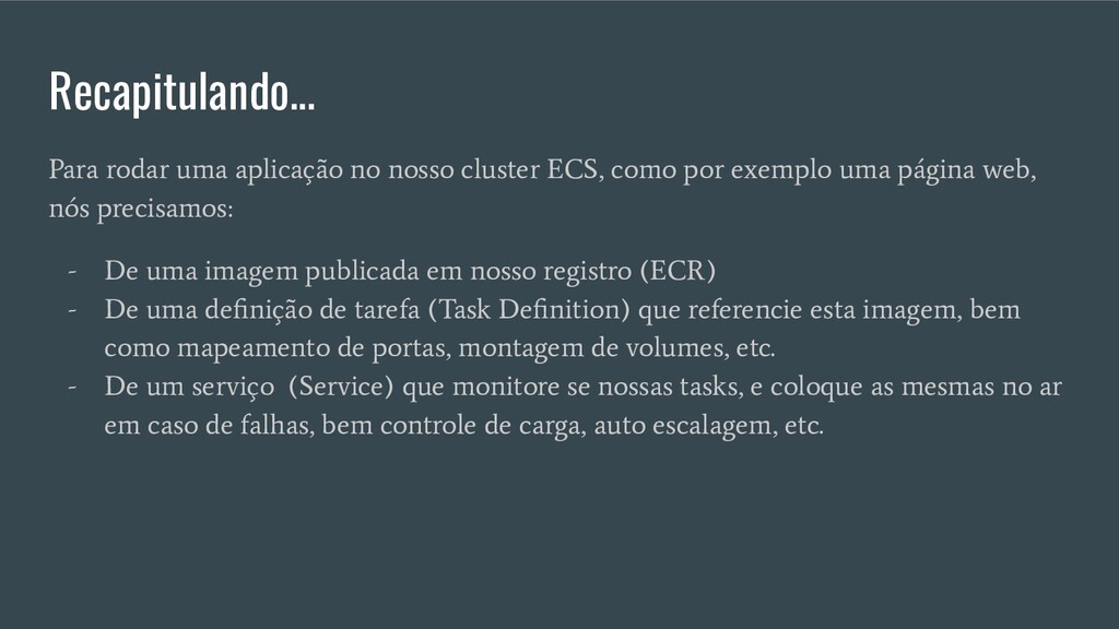 por exemplo uma página web, nós precisamos: - De uma imagem publicada em nosso registro (ECR) - De uma definição de tarefa (Task Definition) que referencie esta imagem, bem como mapeamento de portas, montagem de volumes, etc. - De um serviço (Service) que monitore se nossas tasks, e coloque as mesmas no ar em caso de falhas, bem controle de carga, auto escalagem, etc.