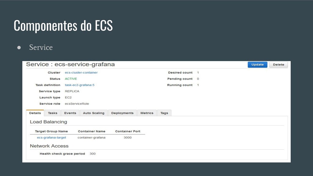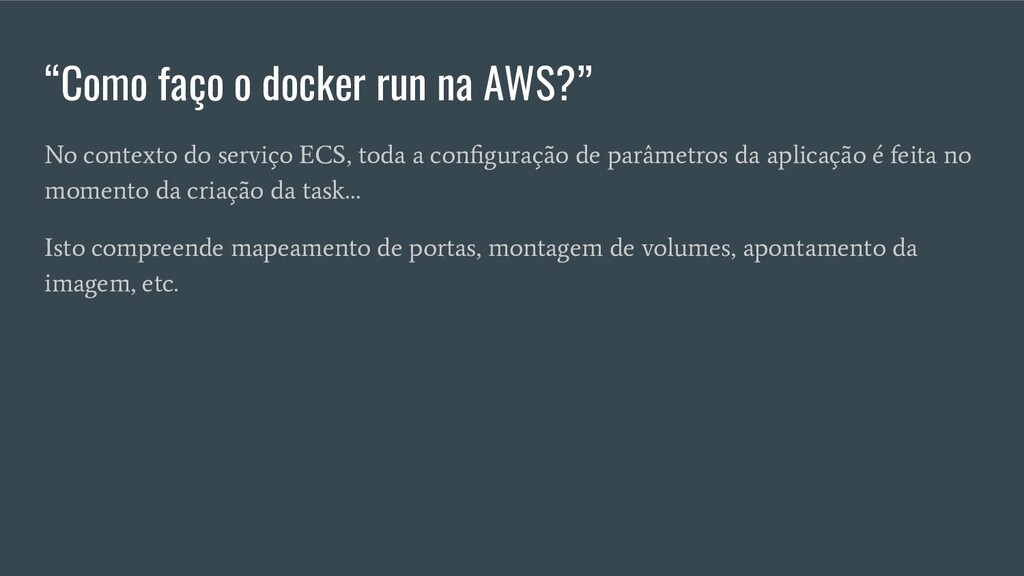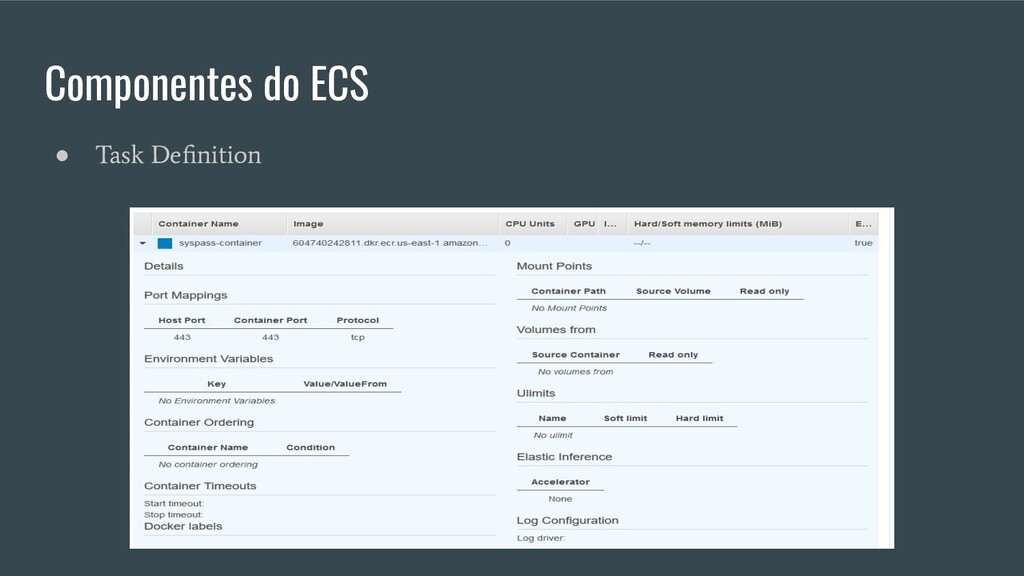 serviço ECS, toda a configuração de parâmetros da aplicação é feita no momento da criação da task… Isto compreende mapeamento de portas, montagem de volumes, apontamento da imagem, etc.